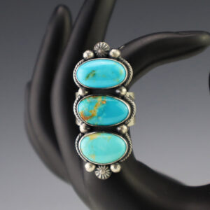 This beautiful ring was hand made by Navajo artist Joelias Draper. Sterling silver with Golden Hills Turquoise stones. It is a great representation of hand made Navajo jewelry. Size 6 3/4. Weighs 20 grams. Signed 1/2″ x 2 7/16″ Artist card included Around 1865, a Navajo Blacksmith Atsidi Sani...