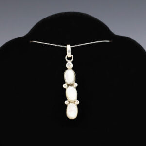Zuni artist Diane Lonjose hand made this beautiful pendant. Made out of sterling silver and Mother of Pearl Shell. The components are all hand fabricated, and the stones are all natural. Diane comes from a family of Zuni jewelers. She is the daughter of Alice and Duane Quam, and grandchild...