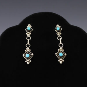 Beautiful earrings hand made out of sterling silver and Turquoise by Navajo silversmith Selena Warner. These fabulous earrings will become a versatile accessory in your jewelry collection. Weighs 8 grams. Signed. 1/2″ x 1 7/8″ Artist card included The Navajos began working with silver in the 19th century, and began...
