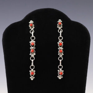 Each earring features Coral set into a sterling silver setting. Hand made by Zuni artist Verdie Booqua. These gorgeous earrings will become a versatile accessory in your jewelry collection. Weighs 8 grams. Signed 1/4″ x 2 3/4″ Artist card included Zuni Pueblo is the largest pueblo...