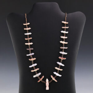 Zuni jewelers Nancy and Sheldon Westika created this exquisite fetish necklace. The birds are hand carved out of Turquoise, Picasso Marble, Mother of Pearl Shell, Spiny Oyster, and Pink Mussel. There is fine Olive Shell in between the fetish and at the ends. This beautiful strand is finished off with...