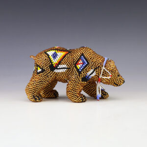 Zuni beadwork has evolved from tourist souvenirs to detailed pieces of folk art. First the Zuni artists carve a wooden form and then they bead over it, using the peyote stitch and seed or glass beads. With a continuous strand, Zuni beaders meticulously create beautiful patterns throughout their beadwork. This...