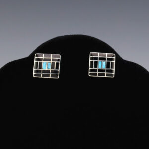 Zuni artist Harlan Coonsis hand made these stunning earrings. Made out of sterling silver and inlaid with Turquoise and Jet. Weighs 12 grams. Signed 5/8” wide x 2” tall Artist card included Zuni Pueblo is the largest pueblo in New Mexico, and because of its location, Zuni...