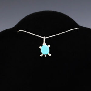 Zuni artists are known for their fine lapidary skills. Each stone is hand cut, polished, and set into a sterling silver setting. This wonderful turtle pendant is inlaid with a Turquoise stone. Hand made by Zuni artist Trista Siow. Weighs 2 grams. (Chain not included) 3/8” wide x 5/8”...