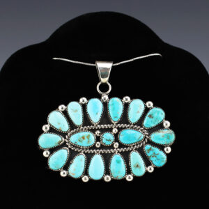 Zuni artist Diane Lonjose hand made this beautiful pendant. Made out of sterling silver and Kingman Turquoise. The components are all hand fabricated, and the stones are all natural. Diane comes from a family of Zuni jewelers. She is the daughter of Alice and Duane Quam, and grandchild of Doris...