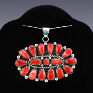 Zuni artist Carlo Lonjose hand made this beautiful pendant. Made out of sterling silver and natural Spiny Oyster. Carlo comes from a family of Zuni jewelers. Weighs 22 grams. Signed (Chain not included) Bail will accommodate up to a 5mm necklace. 2 3/8” wide x 2 1/16” long ...