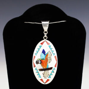 Zuni artist Quintin Quam hand made this exquisite pendant depicting a Parrot. The sterling silver pendant is intricately inlaid with Turquoise, Lapis, Jet, Penn Shell, Gaspeite, Coral, Malachite, and Mother of Pearl Shell. Quintin domed this pendant, giving it a great shape. Amazing detail! Weighs 16 grams. (Chain not included) ...