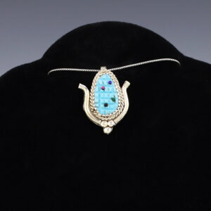 Zuni artist Tracy Bowekaty made this beautiful corn pendant. Zuni artists are known for their fine lapidary skills. Each stone is hand cut, polished, and set into a sterling silver setting. The pendant is inlaid with Turquoise, Coral, Malachite, Lapis, and Jet. Weighs 4 grams. Signed. (Chain not included) ...