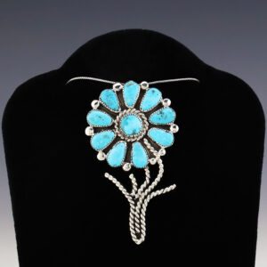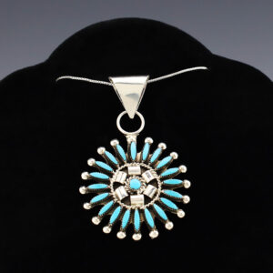 Zuni artists are known for their fine lapidary skills. This pendant is no exception. Zuni artists Lance and Cordelia Waatsa made this stunning pendant out of sterling silver with Turquoise needlepoint stones. Can also be worn as a pin. Weighs 14 grams. (Chain not included) Signed 2″ in diameter...