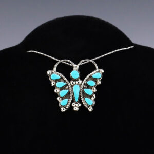Zuni artists are known for their fine lapidary skills. Each stone is hand cut, polished, and set into a sterling silver setting. Zuni jeweler Diane Lonjose made this beautiful butterfly pendant. Sterling silver with Kingman Turquoise. This can be worn as a pendant or pin. Weighs 12 grams. (Chain not...