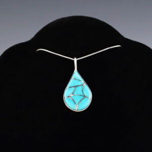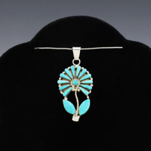 Zuni artist Delorna Lahi hand made this wonderful pendant. Made out of sterling silver and inlaid with Turquoise. Weighs 2 grams. Signed. (Chain not included) 5/8” wide x 1 1/4” long Artist card included Zuni Pueblo is the largest pueblo in New Mexico, and because of its...