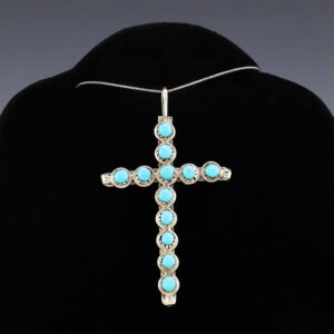 Zuni artists are known for their fine lapidary skills. This cross pendant is no exception. Zuni artist Cecelia Iule made this pendant out of sterling silver and Turquoise. Weighs 12 grams. (Chain not included) Signed. 1 7/8″ wide x 2 15/16” long Artist card included Zuni Pueblo is the largest...