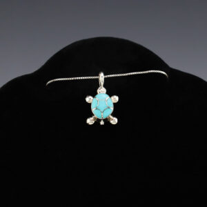 Zuni artists are known for their fine lapidary skills. Each stone is hand cut, polished, and set into a sterling silver setting. This wonderful turtle pendant is inlaid with Turquoise stones. Hand made by Zuni artist Rebecca Lalio. Weighs 2 grams. (Chain not included) 1/2” wide x 7/8” long...