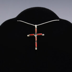 Zuni artists are known for their fine lapidary skills. This cross pendant is no exception. Zuni artist Delberta Boone made this pendant out of sterling silver, Turquoise, Coral, Jet, and Mother of Pearl Shell. Weighs 2 grams. Signed. 1/2″ wide x 1 3/8” long Artist card included ...
