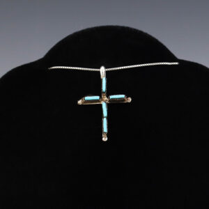 Zuni artists are known for their fine lapidary skills. This cross pendant is no exception. Lovely cross pendant made out of sterling silver and set with Turquoise. (Chain not included) Weighs 2 grams. Signed 9/16” wide x 1” long Zuni Pueblo is the largest pueblo in New Mexico,...