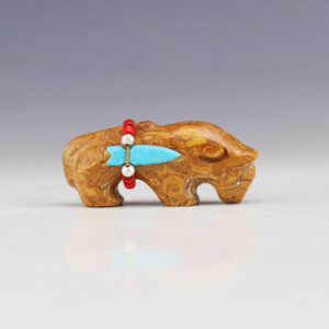Zuni fetish carver Cheryl Beyuka carved this outstanding Bear fetish out Fishrock. On his back is a Dragonfly made out of Turquoise, Spiny Oyster, and Mother of Pearl Shell. The Bear is the Guardian fetish of the West, and represents healing and strength. A great addition to your Native American...