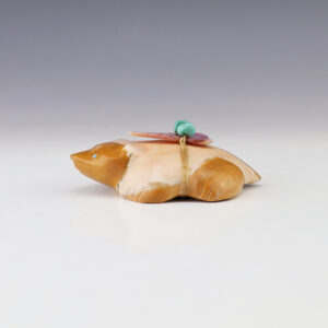 Zuni mole fetishes amplify the connection with the earth and are the protectors of the crops. The mole is also one of the six directional fetishes and represents the Underground. Zuni artist Evalena Boone made this stellar Mole fetish. Hand carved out of Purisima Stone and is bundled with Turquoise,...