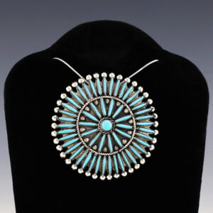 Zuni artists are known for their fine lapidary skills. This pendant is no exception. Zuni artists Lance and Cordelia Waatsa made this stunning pendant out of sterling silver with Turquoise needlepoint stones. Can also be worn as a pin. Weighs 14 grams. (Chain not included) Signed 2″ in diameter...