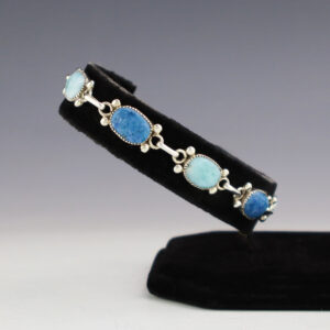 Zuni jeweler Diane Lonjose hand crafted this lovely link bracelet. The bracelet is sterling silver and is set with natural Denim Lapis and Larimar stones. The components are all hand fabricated, and the stones are all natural. Diane comes from a family of Zuni jewelers. She is the daughter of...