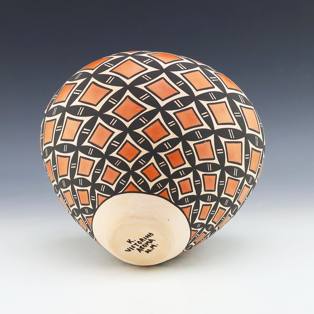 Brilliantly constructed by hand from natural clay, the pot is covered in intricate black and white designs. Acoma potter, Kathy Victorino made this stunning olla. Kathy was born in 1968 and has been making pottery since she was 16 years old. She is an exceptional painter and specializes in fine line designs, using all natural materials for her paints. A unique addition to any pottery or Native American art collection. Signed (note-base of vase is a little uneven, making the pot rock a little, it needs to be kept on a stable shelf with no movement)