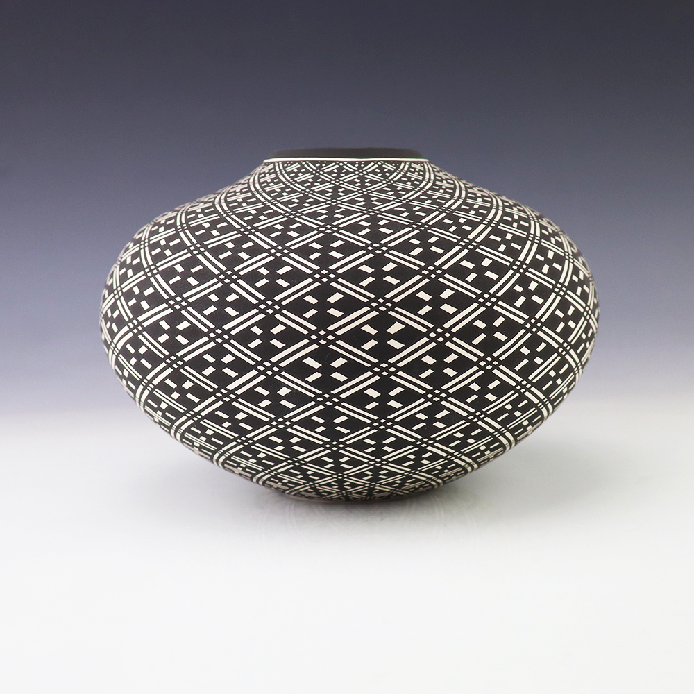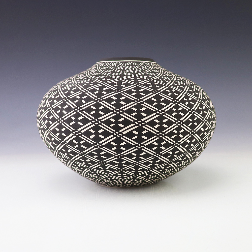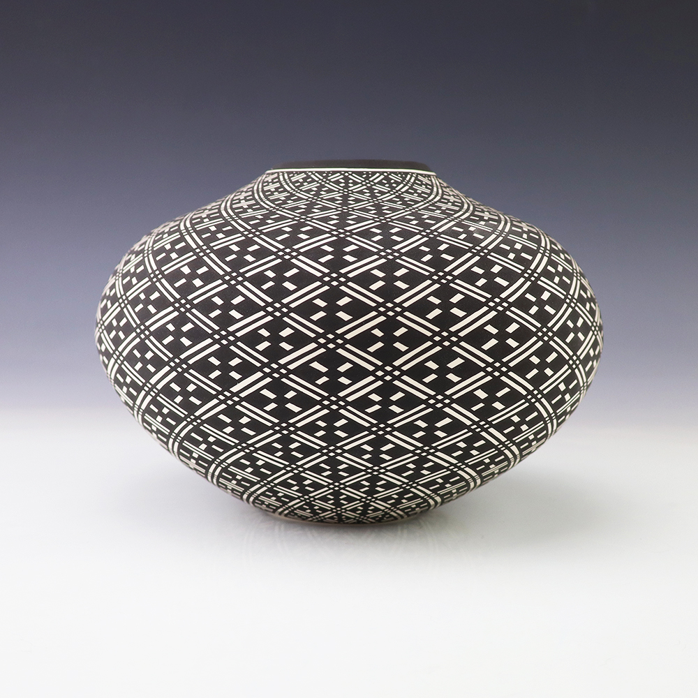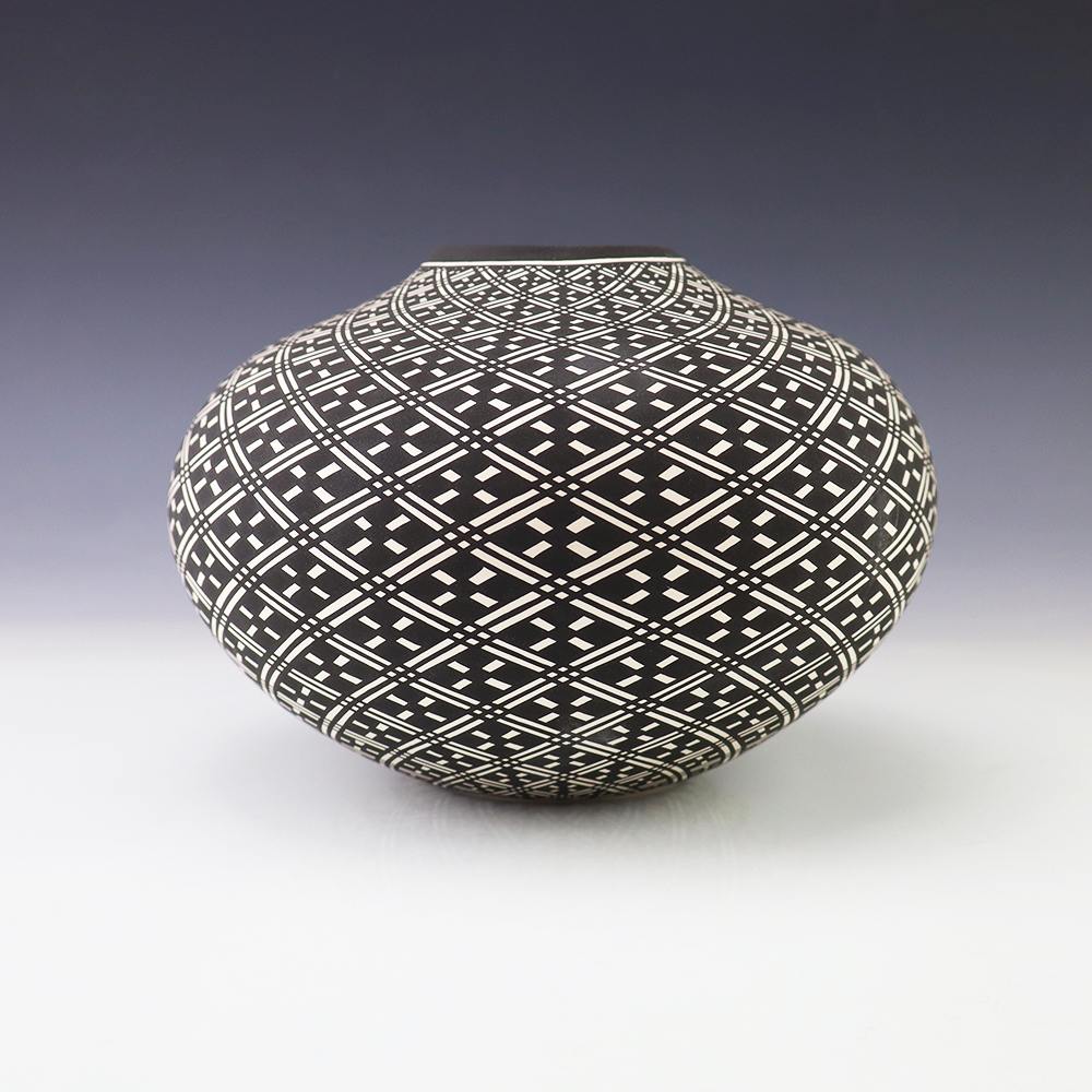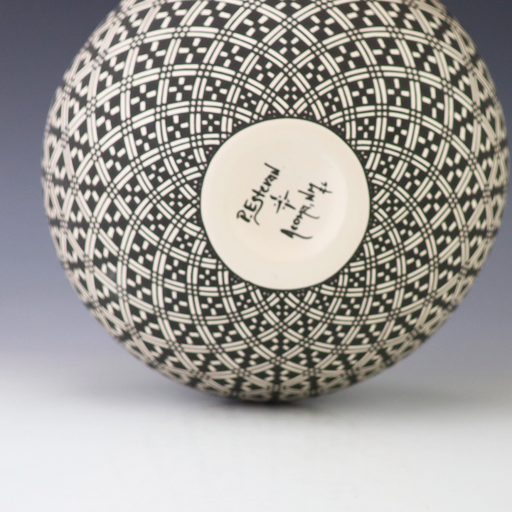 This eye dazzler was hand made by Acoma potter Paula Estevan. Paula was born in Acoma Pueblo in 1967. She learned the art of making pottery in the traditional way from her mother, Patricia Estevan, and from Mary Chino and Victoria Garcia. She’s been producing pottery since 1986. Paula’s hand coiled pots are exceptional examples of Acoma pottery with perfect shape and fine, thin walls. Her design process involves selecting a single Acoma design element and repeating it in an extremely fine progressive pattern across the entire surface of the pot. A unique addition to any pottery or Native American art collection. Signed