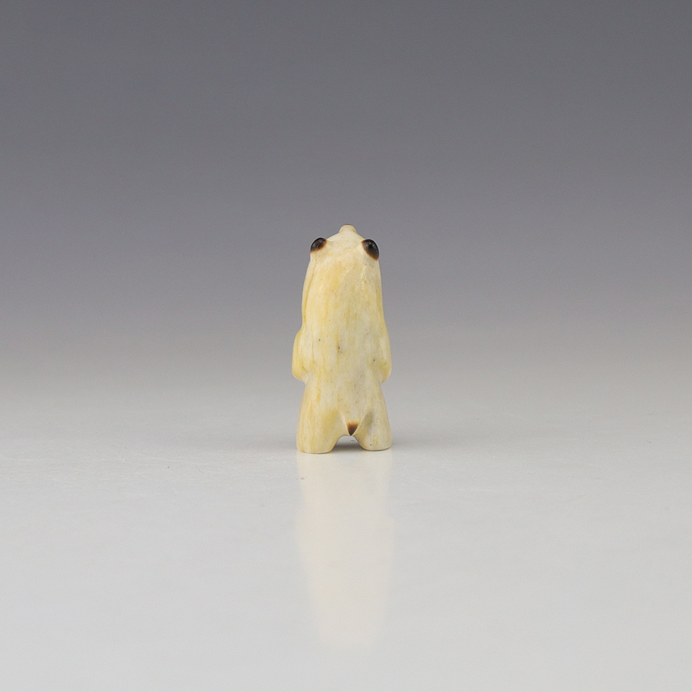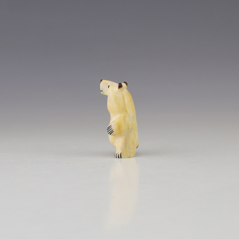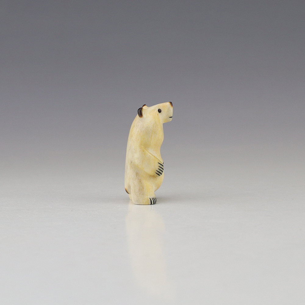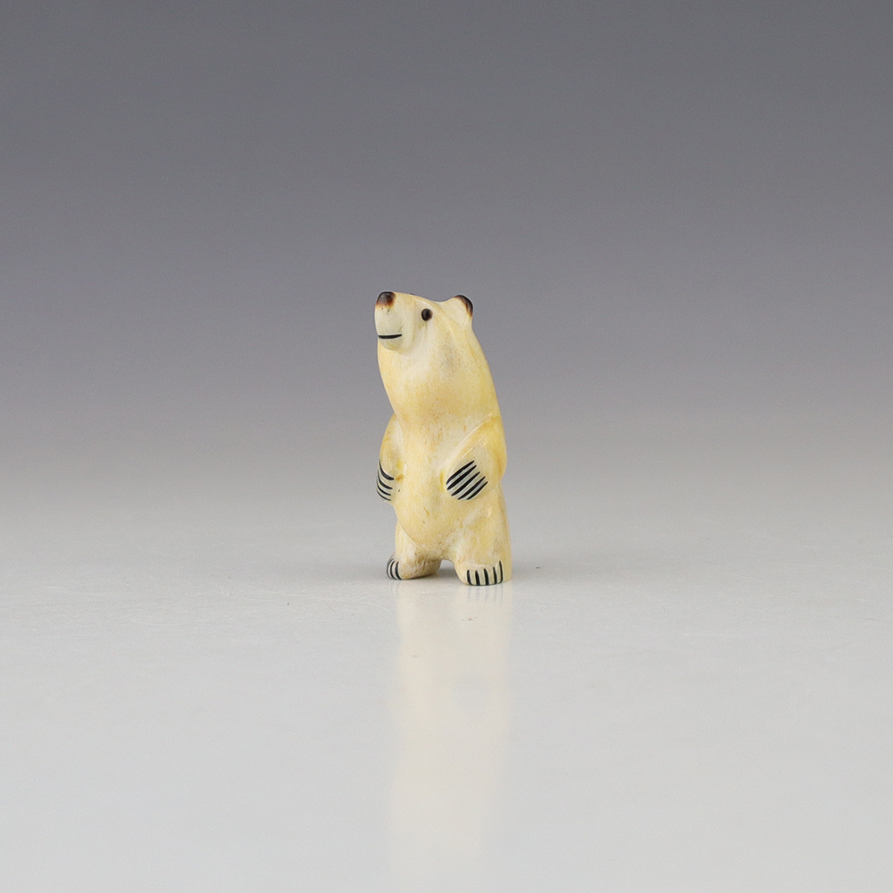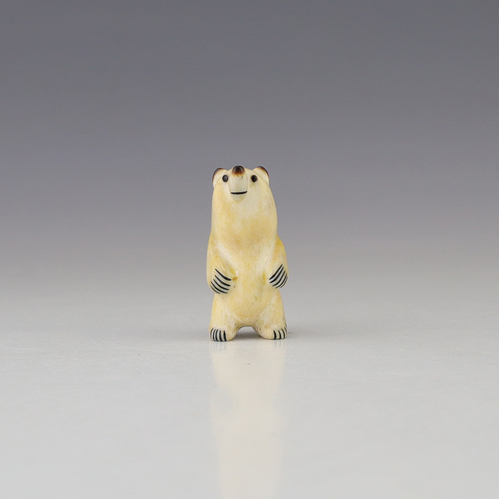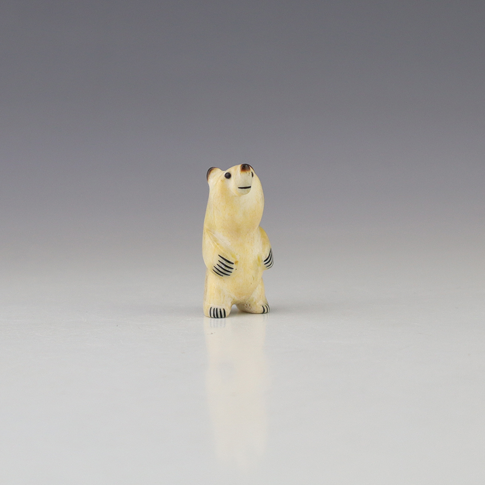 The Bear is the Guardian fetish of the West, and represents healing and strength. This wonderfully carved bear fetish is made out of Antler. Zuni artist Gabe Sice is known for this outstanding bears. This carving would make a great addition to your Native American art or Zuni fetish collection. Signed