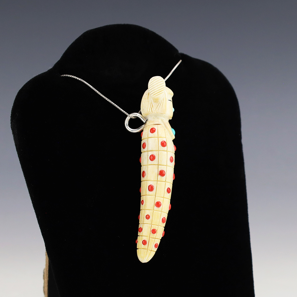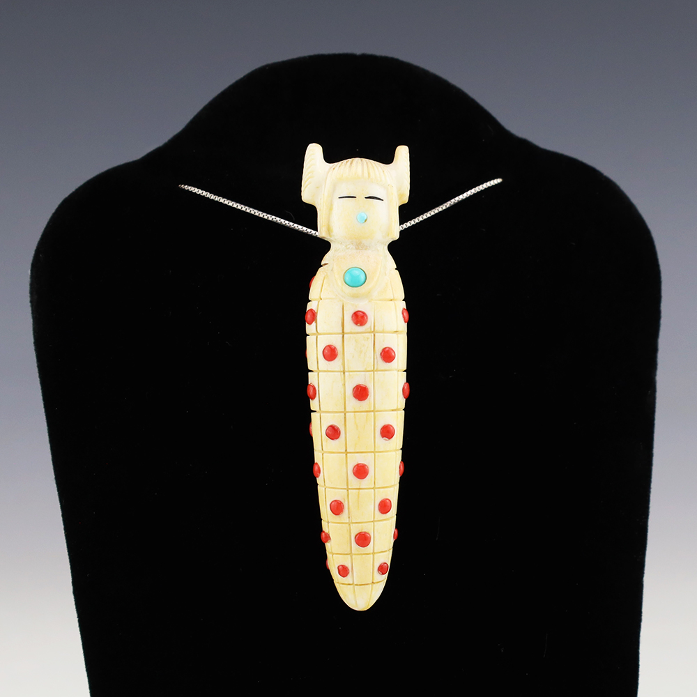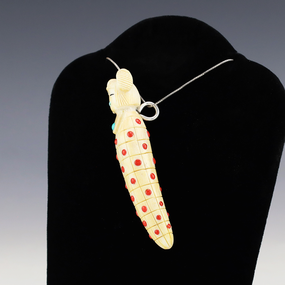 Zuni artist Gabe Sice hand carved this stunning maiden fetish. She is made out of a Cow Horn and inlaid with natural Sleeping Beauty Turquoise and Mediterranean Coral. Amazing detail! The maiden would make a great addition to your Native American or Zuni fetish collection. Signed 5 5/8” tall x...