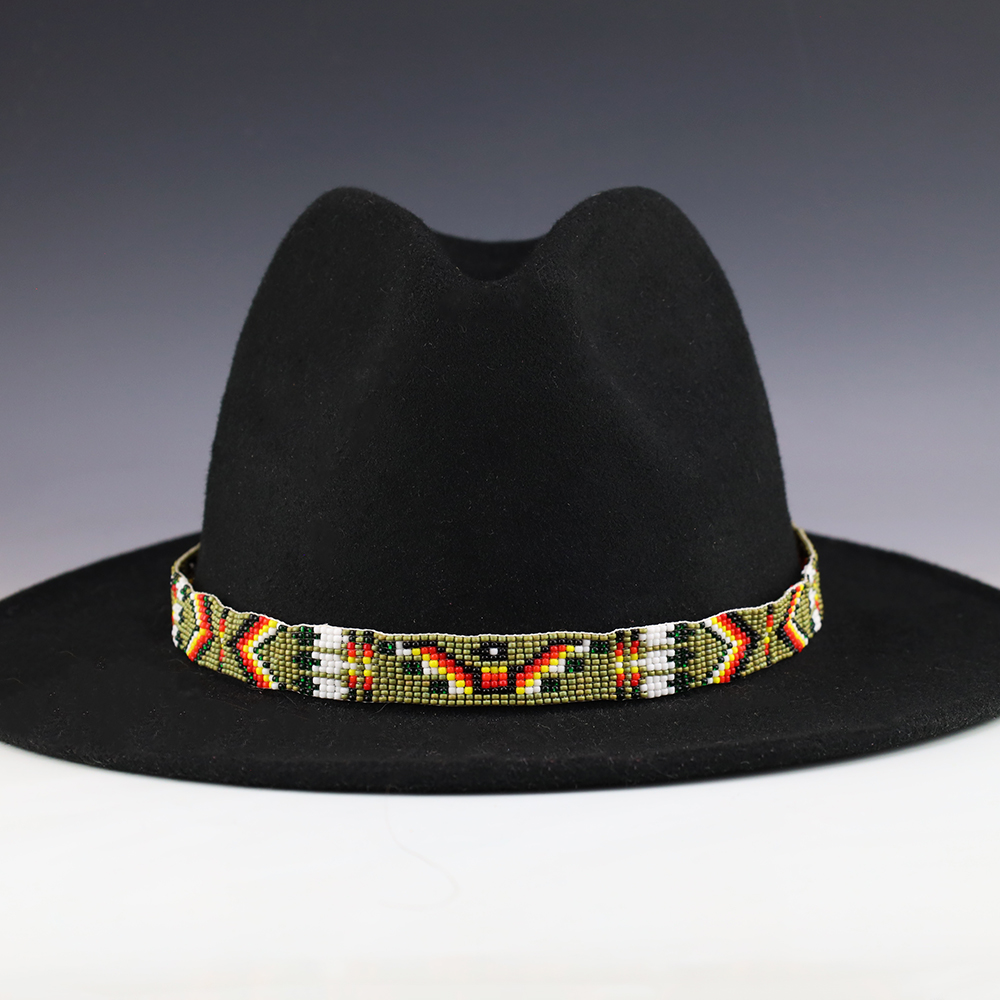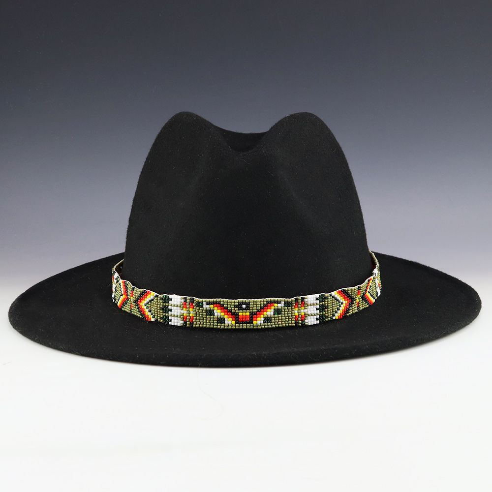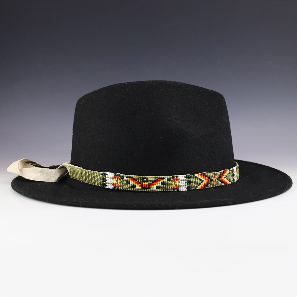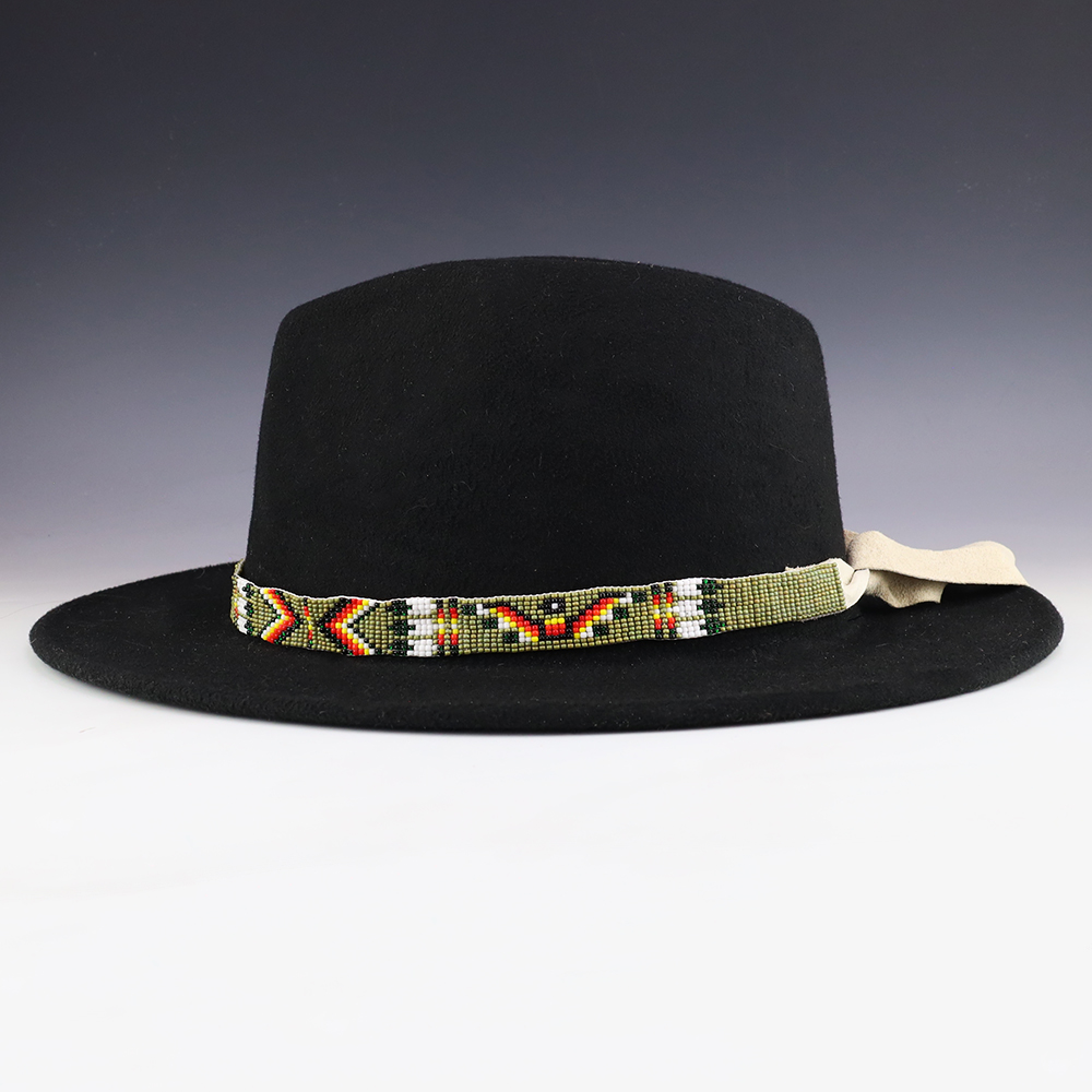 Great colors and patterns in this hand made beaded hat band. Tiny seed beads are used and with soft leather on the ends. Hand made by Navajo artist, Charlene Jackson. (Hat not included)