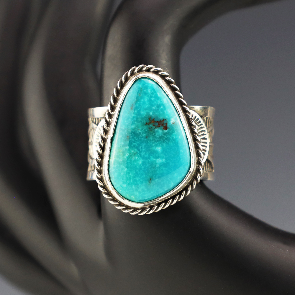 Amazing inlay work! Zuni jewelry makers, Nancy and Sheldon Westika created this magnificent ring. Made out of sterling silver and inlaid with Kingman Turquoise and Jet. Zuni artists are known for their lapidary work. The Westikas have been making jewelry since the 1970’s and they are known for their fine...