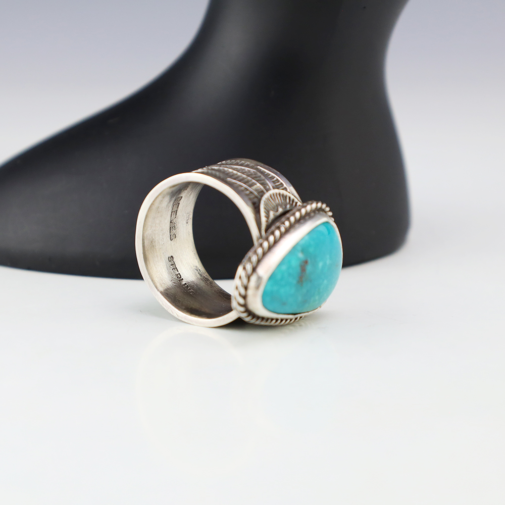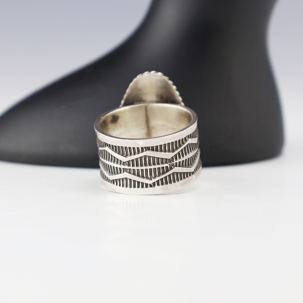 Navajo artist Sunshine Reeves hand crafted this exquisite ring out of sterling silver. Great design. Weighs 14 grams. Signed. Size 9 3/4. note-ring measures at size 9 3/4, but fits about 9 1/4 because of the width of the band.