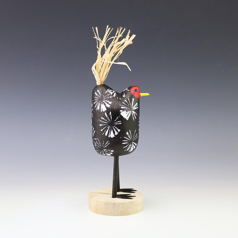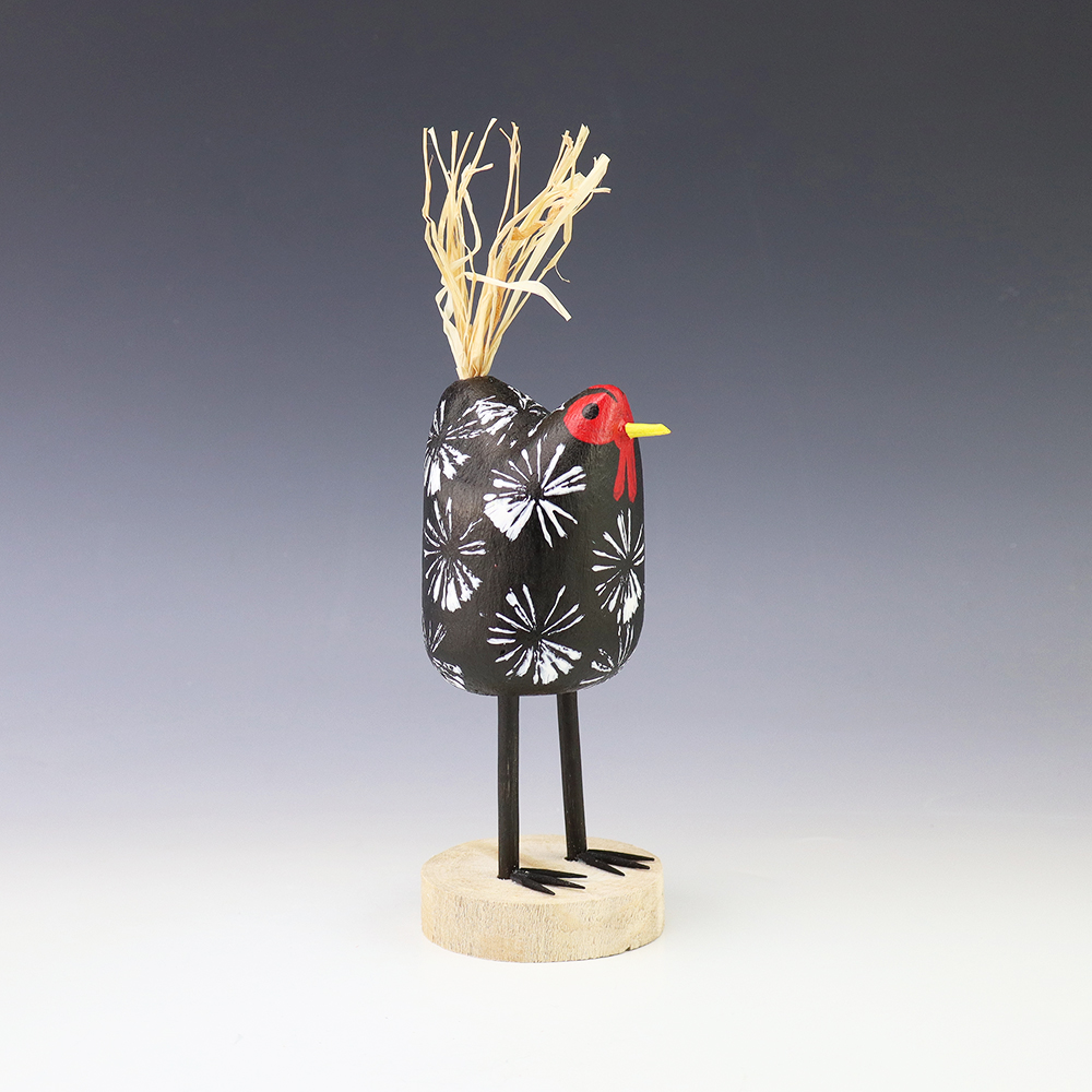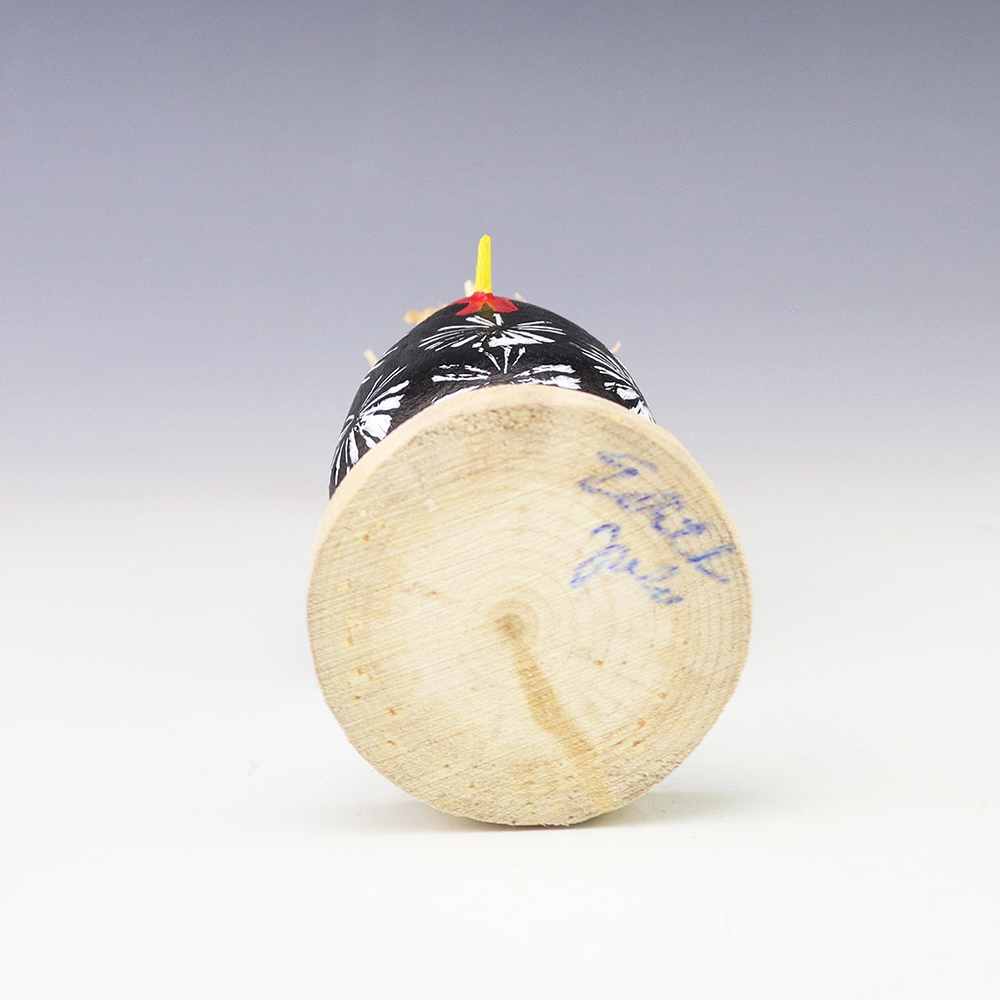 Edith John is the daughter of the late Woody Herbert who was known for his folk art Brahma bulls. Edith started carving while helping her father. Edith’s folk art chickens elicit happiness wherever they roost! Bold colors and patterns, that will brighten your Navajo folk art collection. Hand carved out of wood with a straw tail. Signed