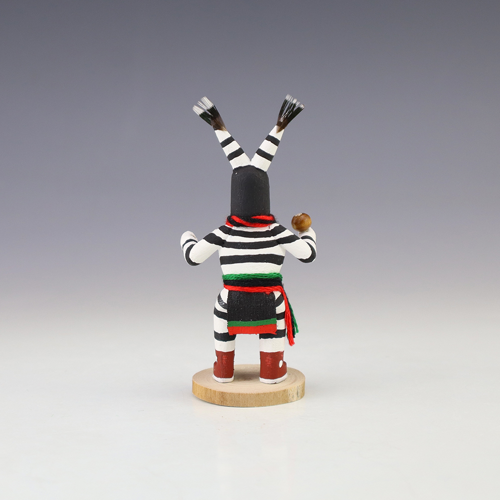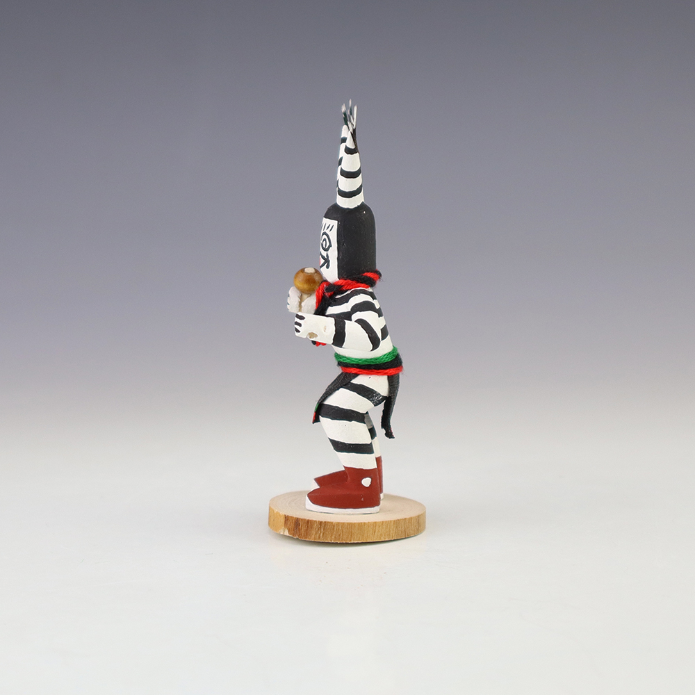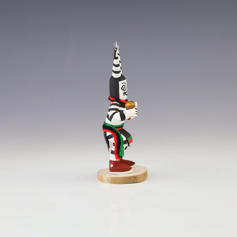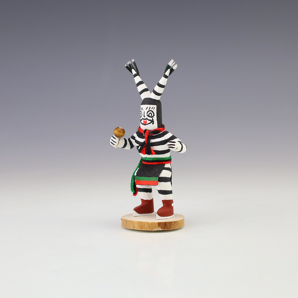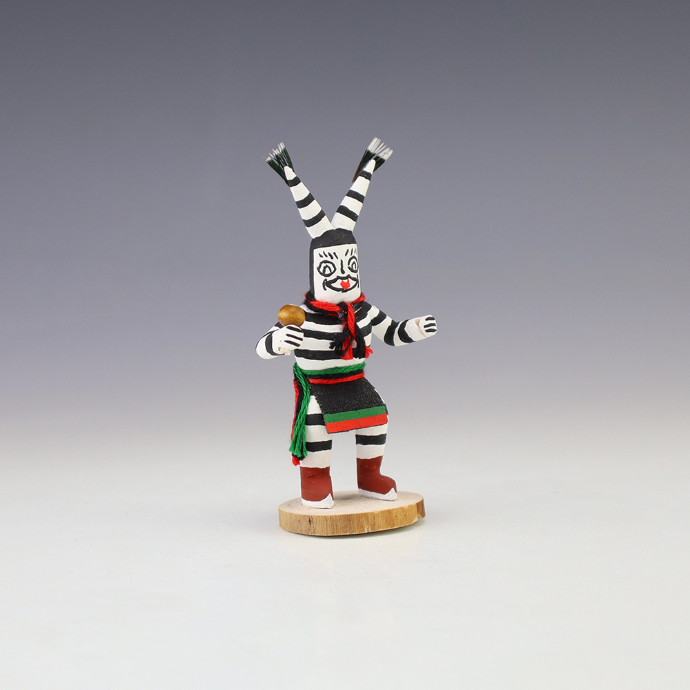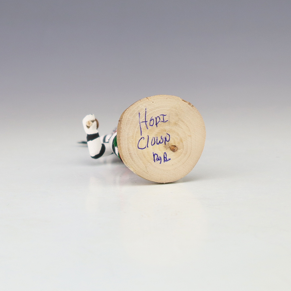 Hopi/Acoma artist Adrian Leon creates wonderful miniature kachinas, and this Clown Kachina is no exception. Delicately carved and painted, this marvelous carving would be a great addition to your kachina or Native American art collection. Signed