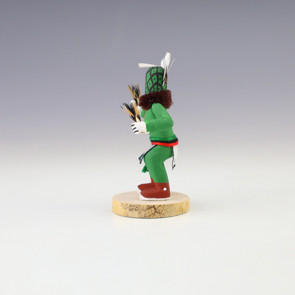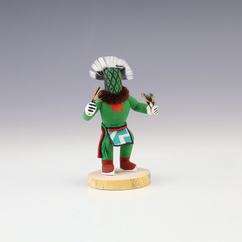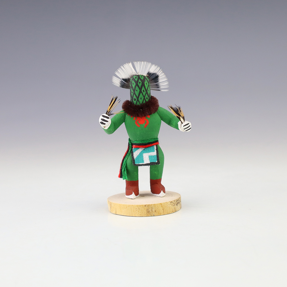 Hopi/Acoma artist Adrian Leon creates wonderful miniature kachinas, and this Cocklebur Kachina is no exception. Delicately carved and painted, this marvelous carving would be a great addition to your kachina or Native American art collection. Signed