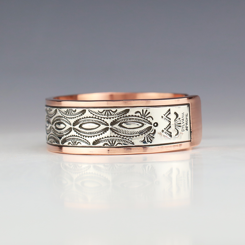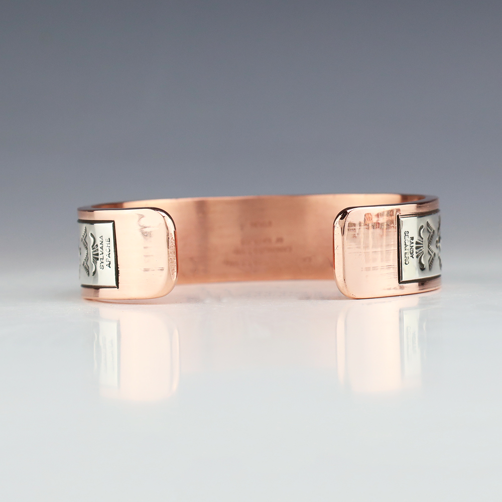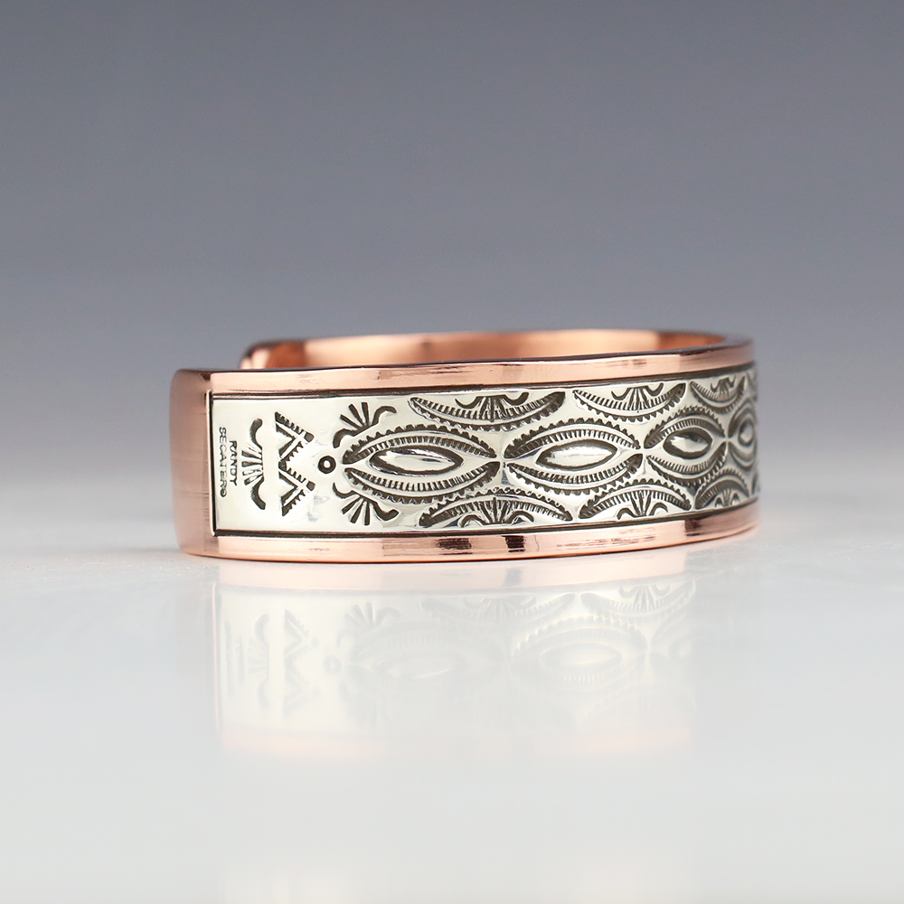 Navajo artists Randy Secatero and Sylvana Apache hand crafted this stellar bracelet. Sterling silver and Copper with a traditional hand stamped design. Weighs 98 grams. The entire inner circumference is about 8”, including 1 1/4” opening. (Fits a 8″ wrist) Signed