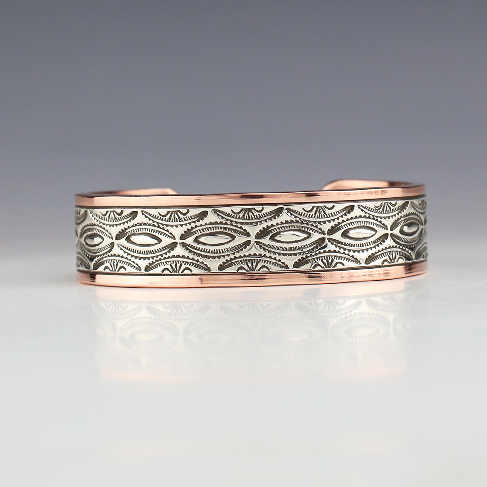 Navajo artists Randy Secatero and Sylvana Apache hand crafted this stellar bracelet. Sterling silver and Copper with a traditional hand stamped design. Weighs 98 grams. The entire inner circumference is about 8”, including 1 1/4” opening. (Fits a 8″ wrist) Signed