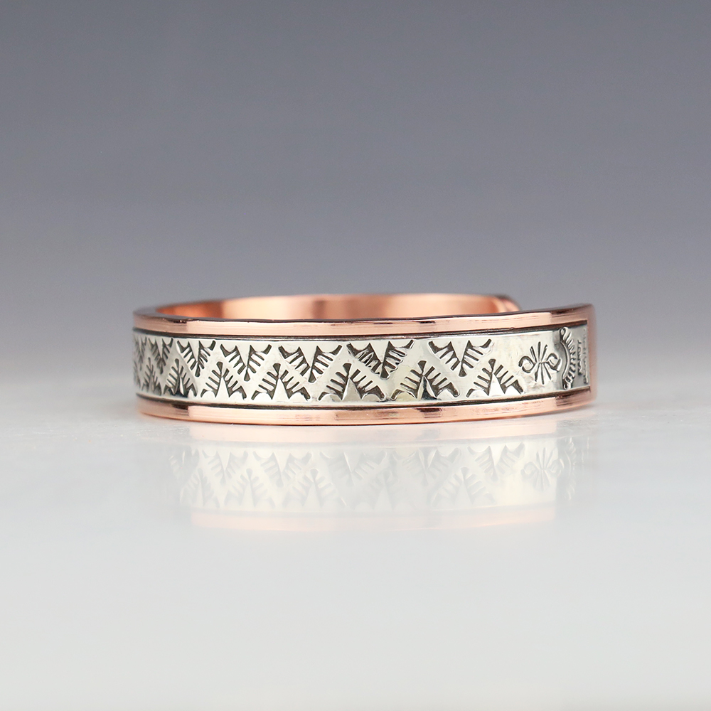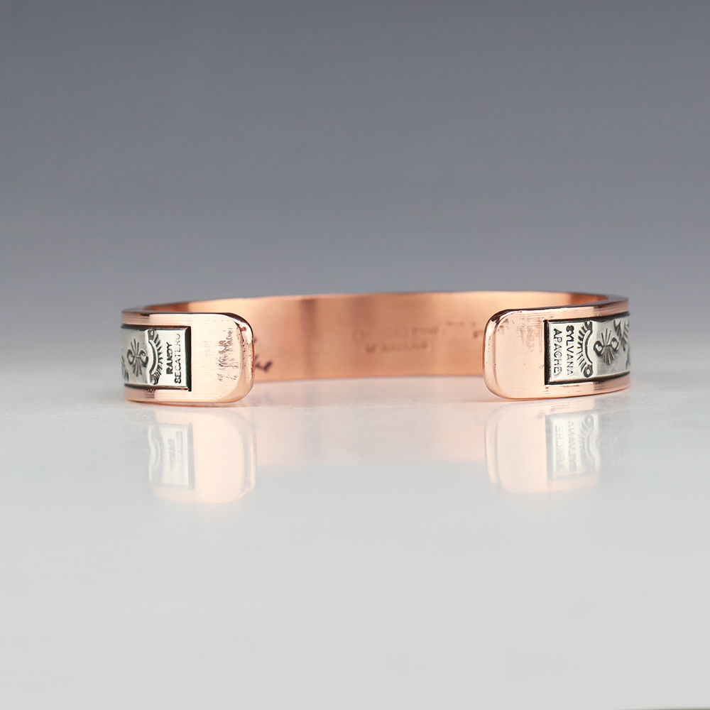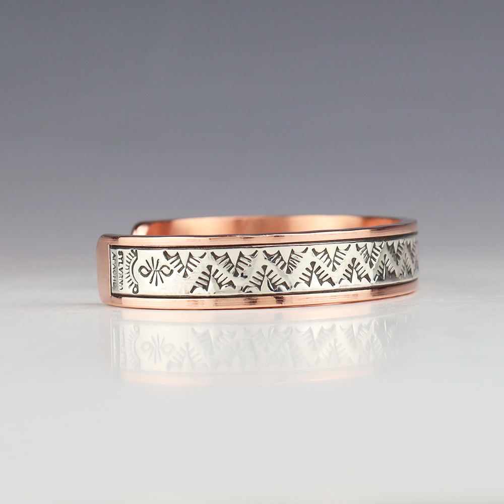 Navajo jewelers Randy Secatero and Sylvana Apache hand crafted this stellar bracelet. Sterling silver and Copper with a traditional hand stamped design. Weighs 64 grams. The entire inner circumference is about 7 3/4”, including 1 1/4” opening. (Fits a 7 3/4″ wrist) Signed