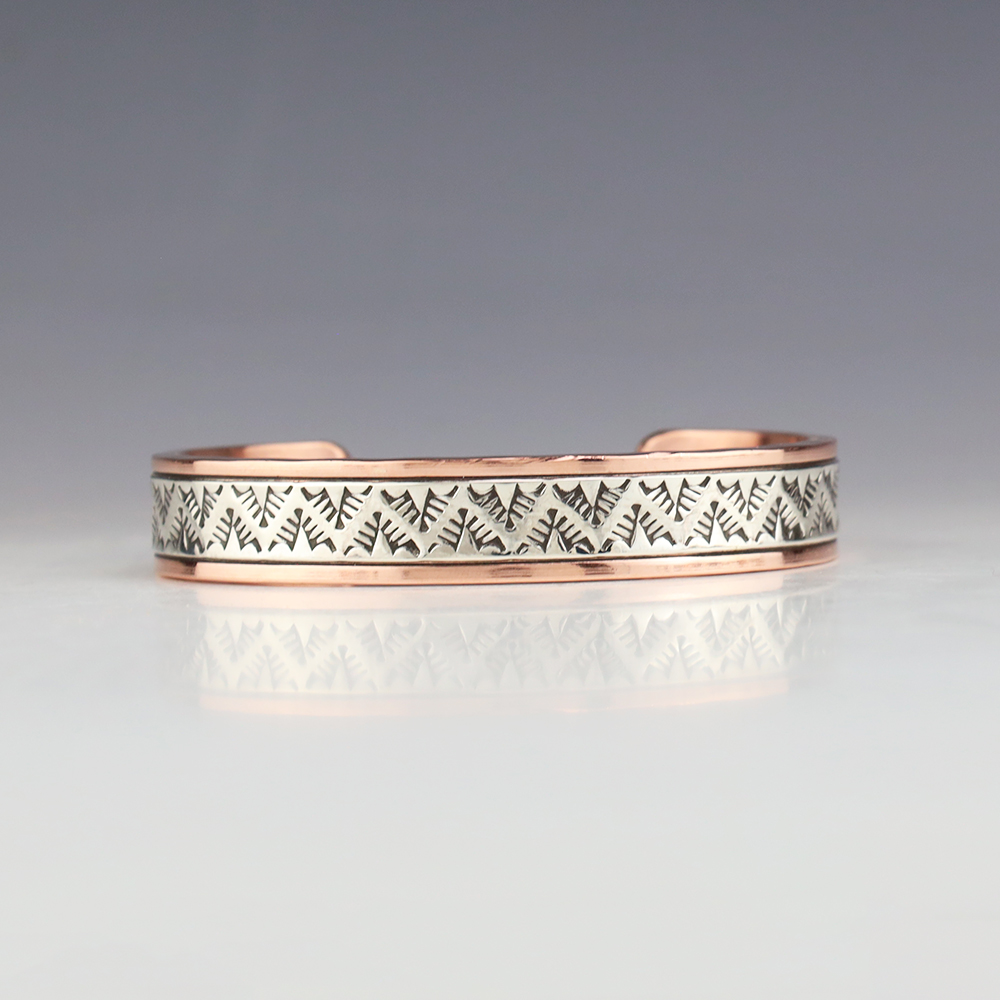 Navajo jewelers Randy Secatero and Sylvana Apache hand crafted this stellar bracelet. Sterling silver and Copper with a traditional hand stamped design. Weighs 64 grams. The entire inner circumference is about 7 3/4”, including 1 1/4” opening. (Fits a 7 3/4″ wrist) Signed
