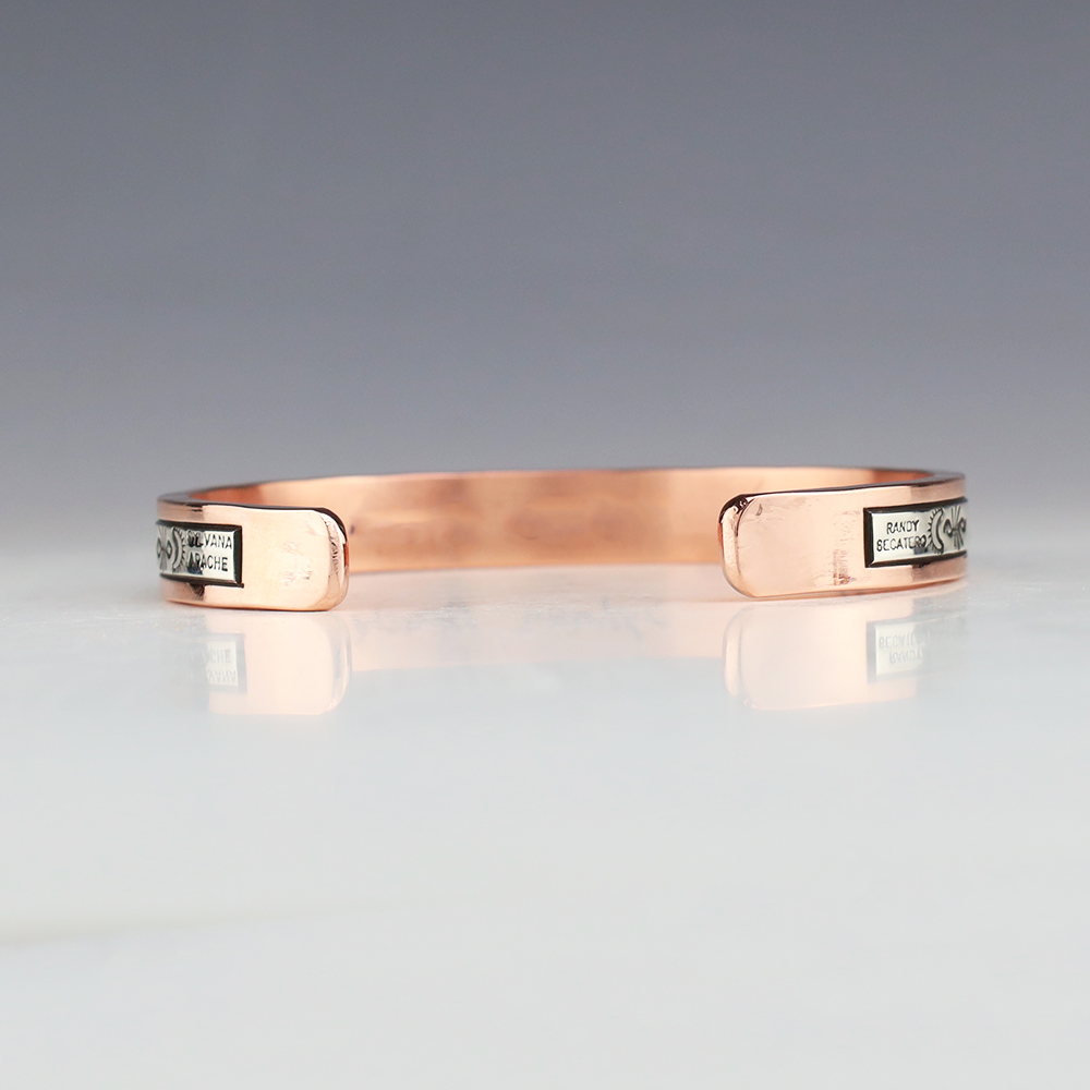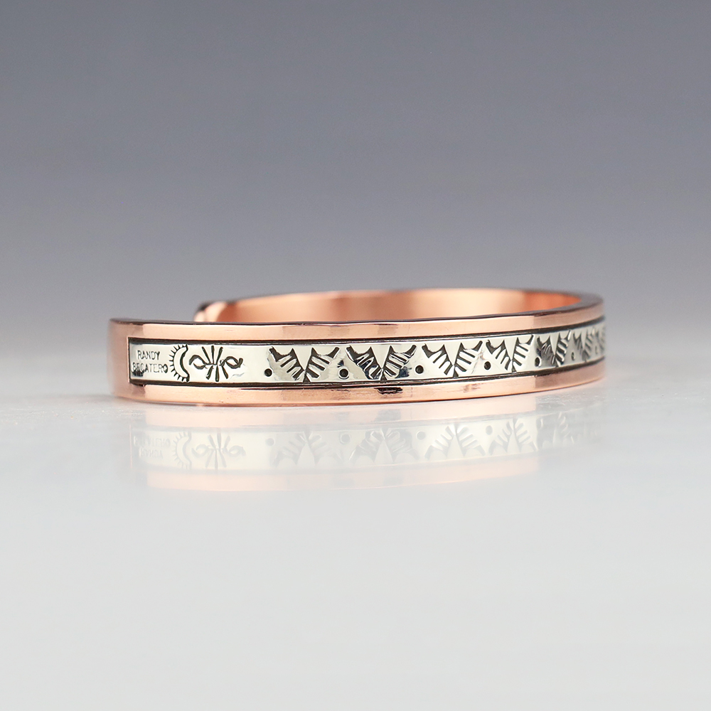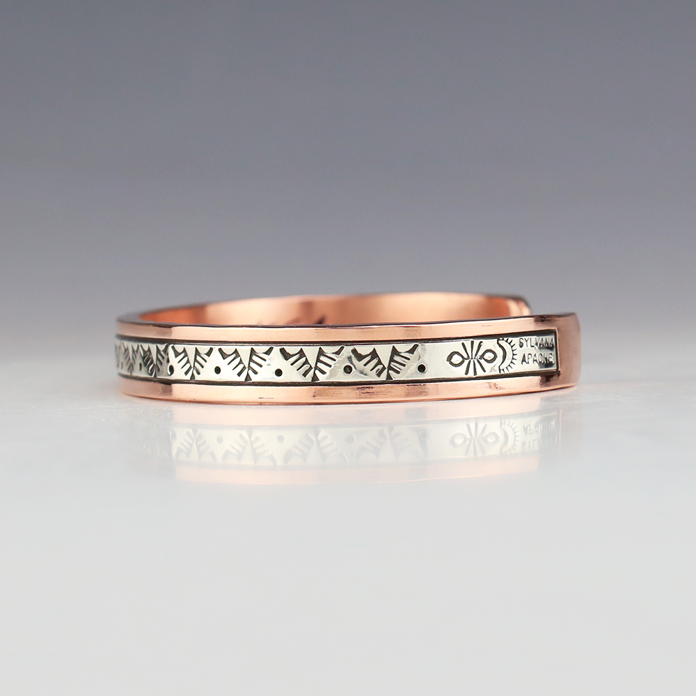 Navajo artists Randy Secatero and Sylvana Apache made this marvelous bracelet. Sterling silver and Copper with a traditional hand stamped design. Weighs 48 grams. The entire inner circumference is about 8”, including 1 1/4” opening. (Fits a 8″ wrist) Signed