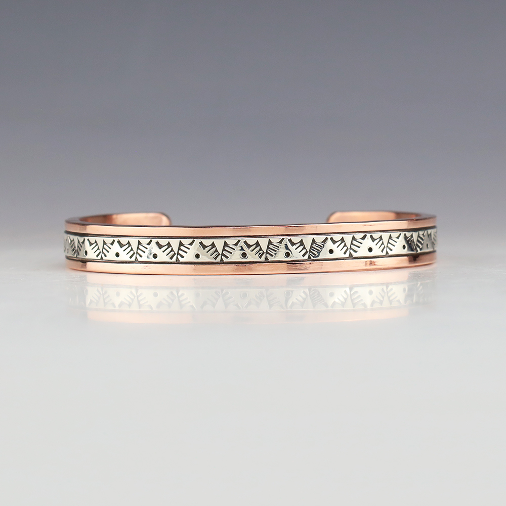 Navajo artists Randy Secatero and Sylvana Apache made this marvelous bracelet. Sterling silver and Copper with a traditional hand stamped design. Weighs 48 grams. The entire inner circumference is about 8”, including 1 1/4” opening. (Fits a 8″ wrist) Signed