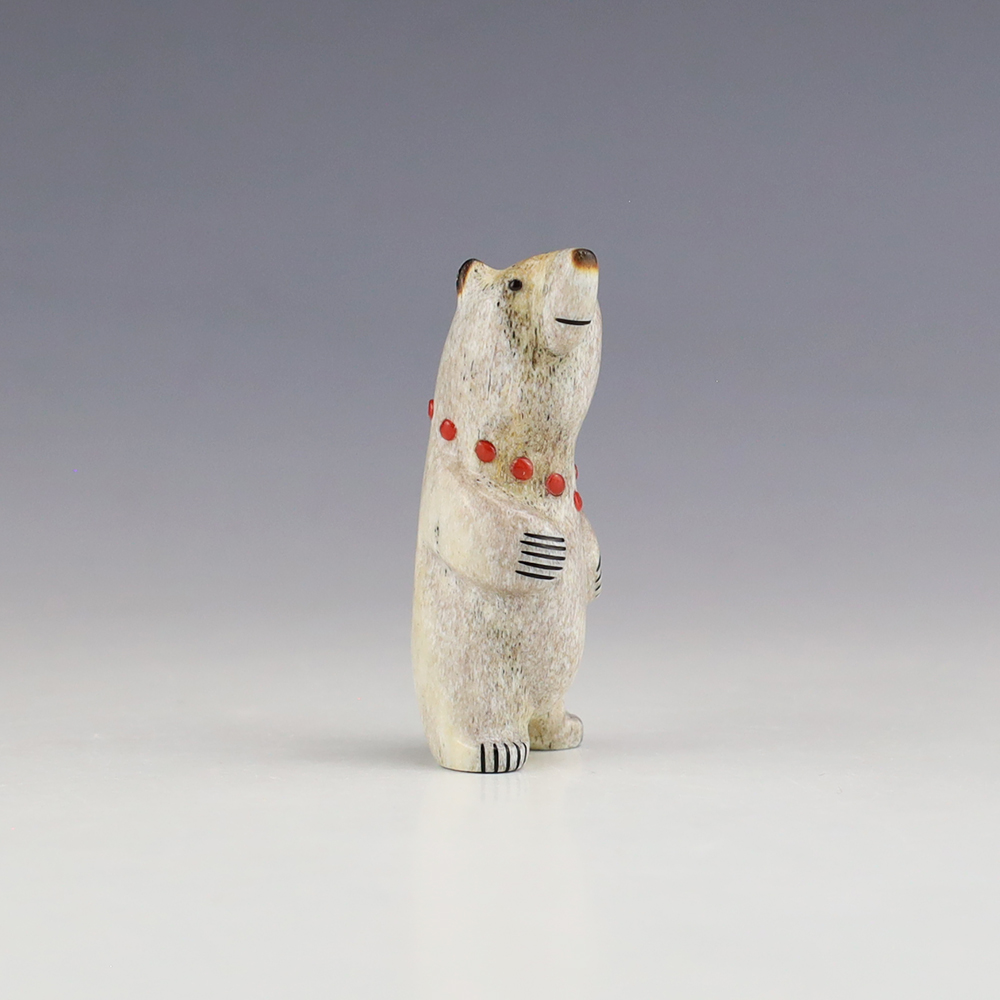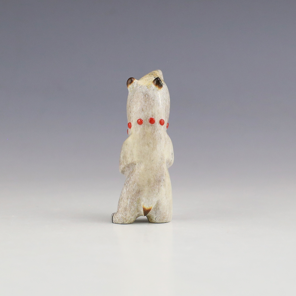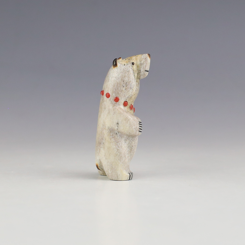 The Bear is the Guardian fetish of the West, and represents healing and strength. This wonderfully carved bear fetish is made out of Antler and inlaid with natural Coral. Zuni artist Gabe Sice is known for this outstanding bears. This carving would make a great addition to your Native American art or Zuni fetish collection. Signed
