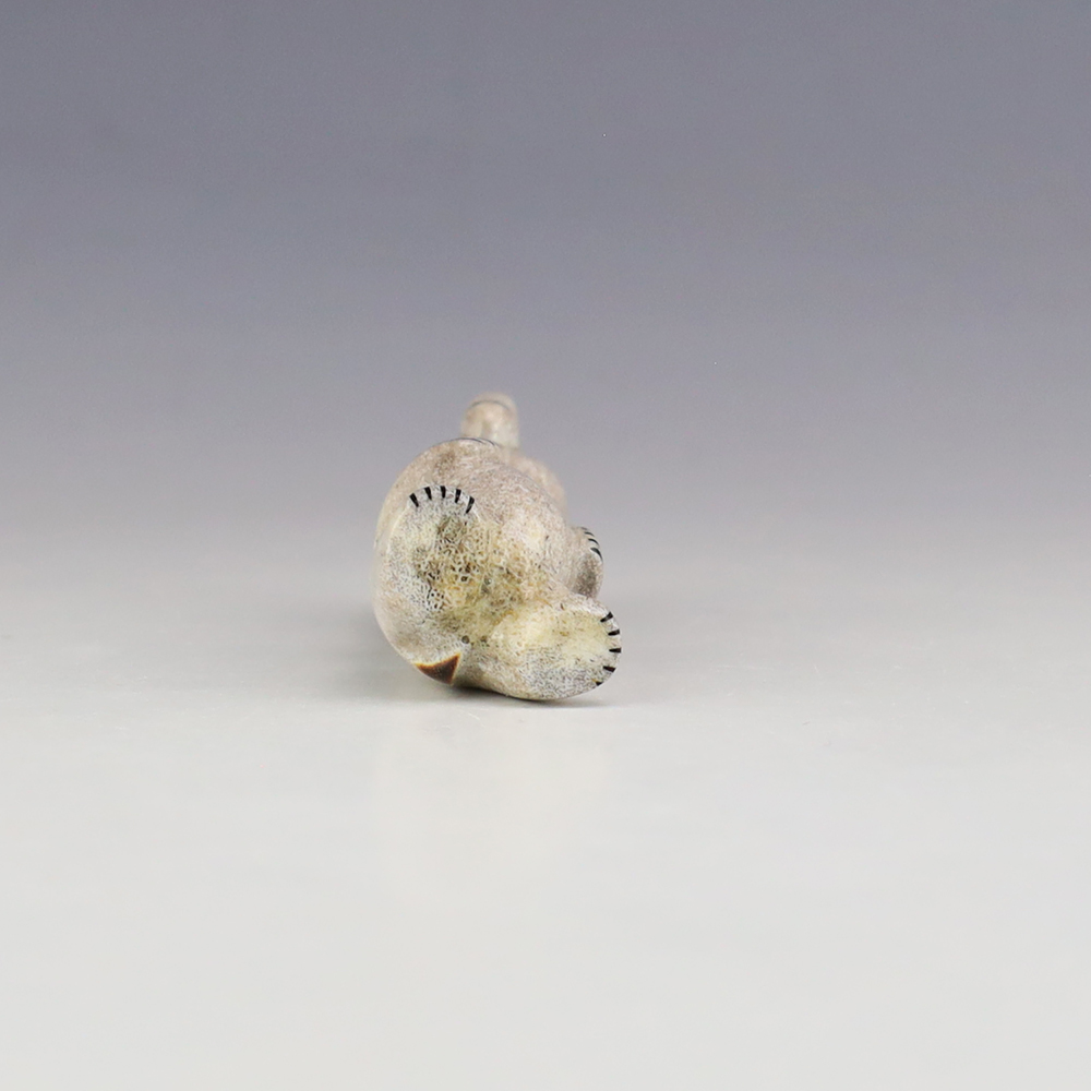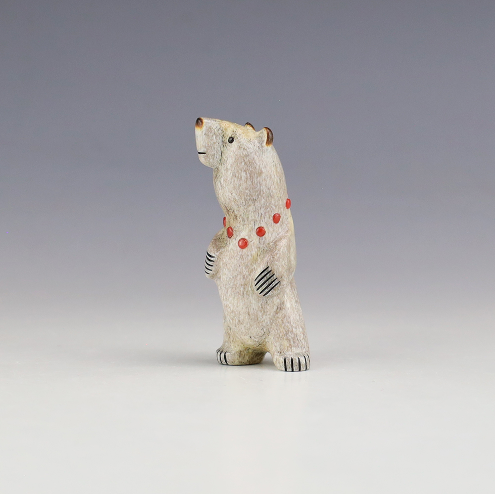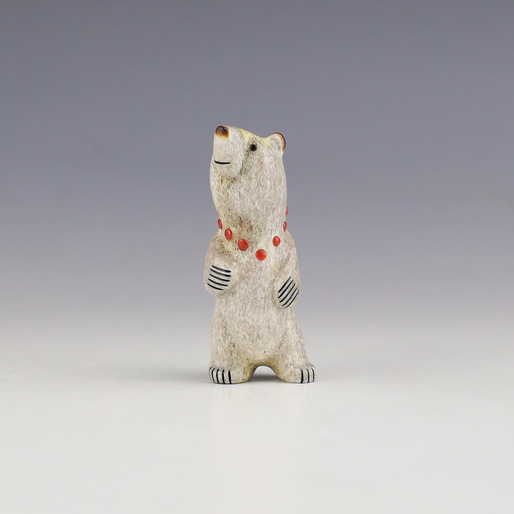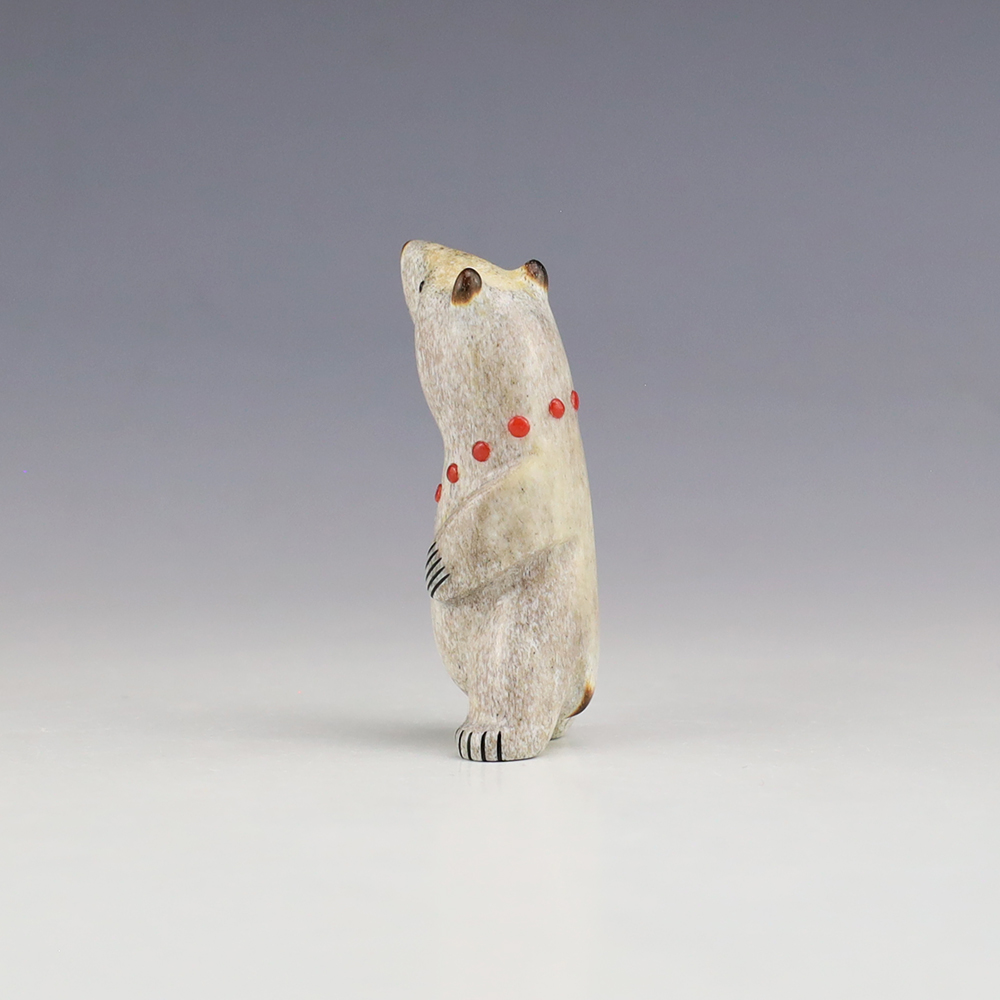 The Bear is the Guardian fetish of the West, and represents healing and strength. This wonderfully carved bear fetish is made out of Antler and inlaid with natural Coral. Zuni artist Gabe Sice is known for this outstanding bears. This carving would make a great addition to your Native American art or Zuni fetish collection. Signed