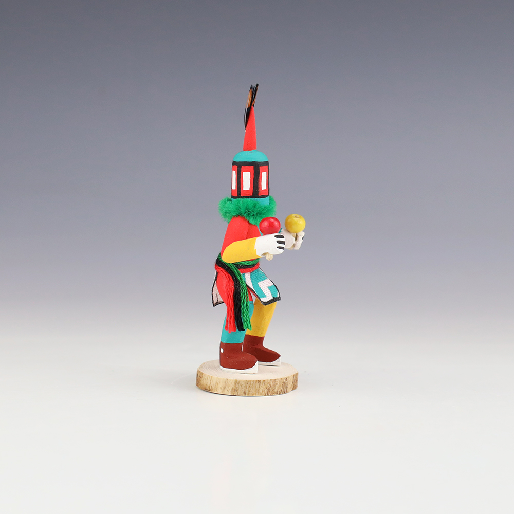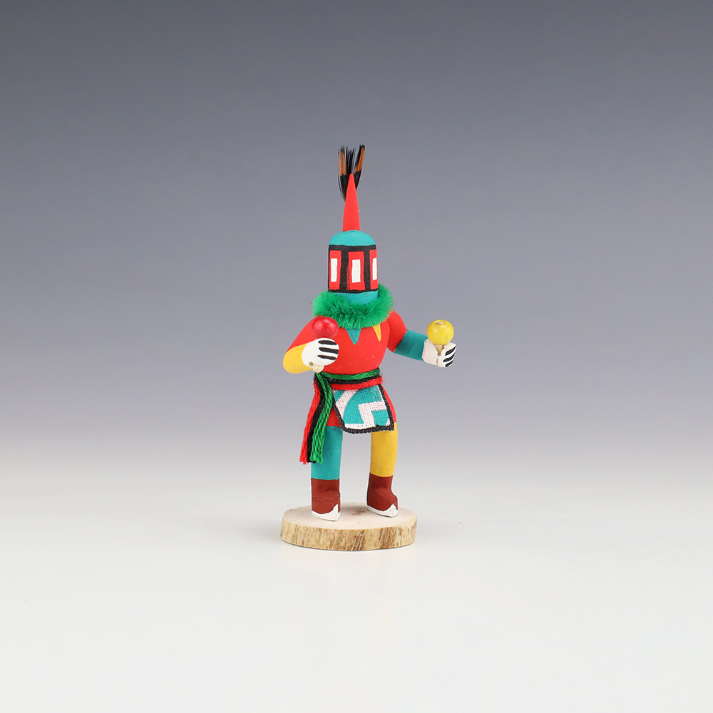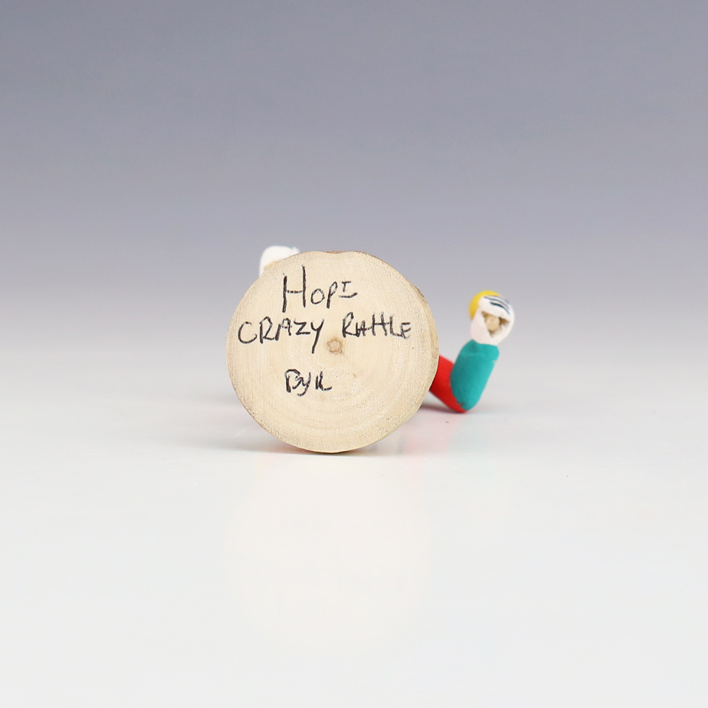 Hopi/Acoma artist Adrian Leon creates wonderful miniature kachinas, and this Crazy Rattle Kachina is no exception. Delicately carved and painted, this marvelous carving would be a great addition to your kachina or Native American art collection. Signed