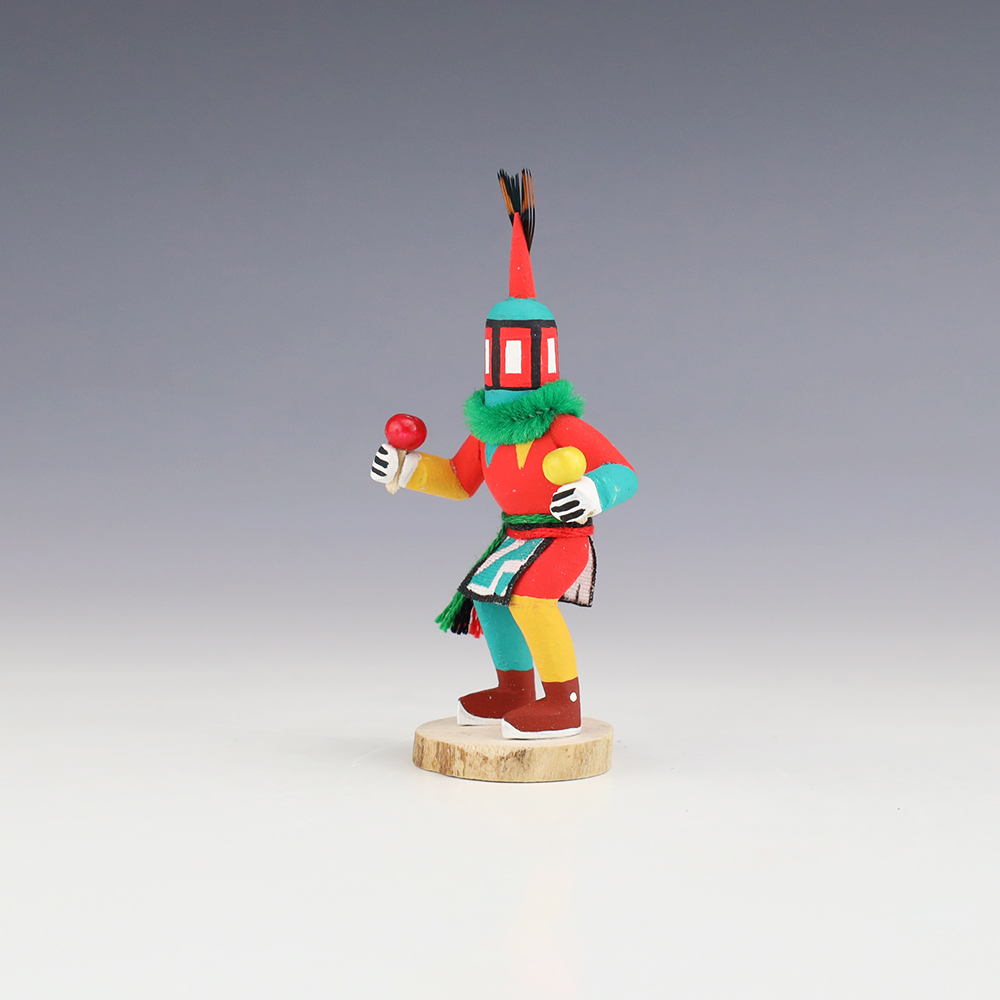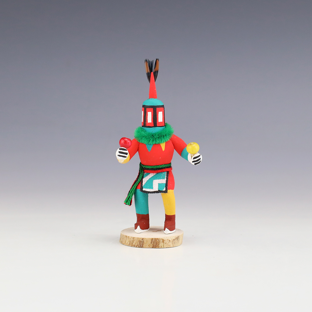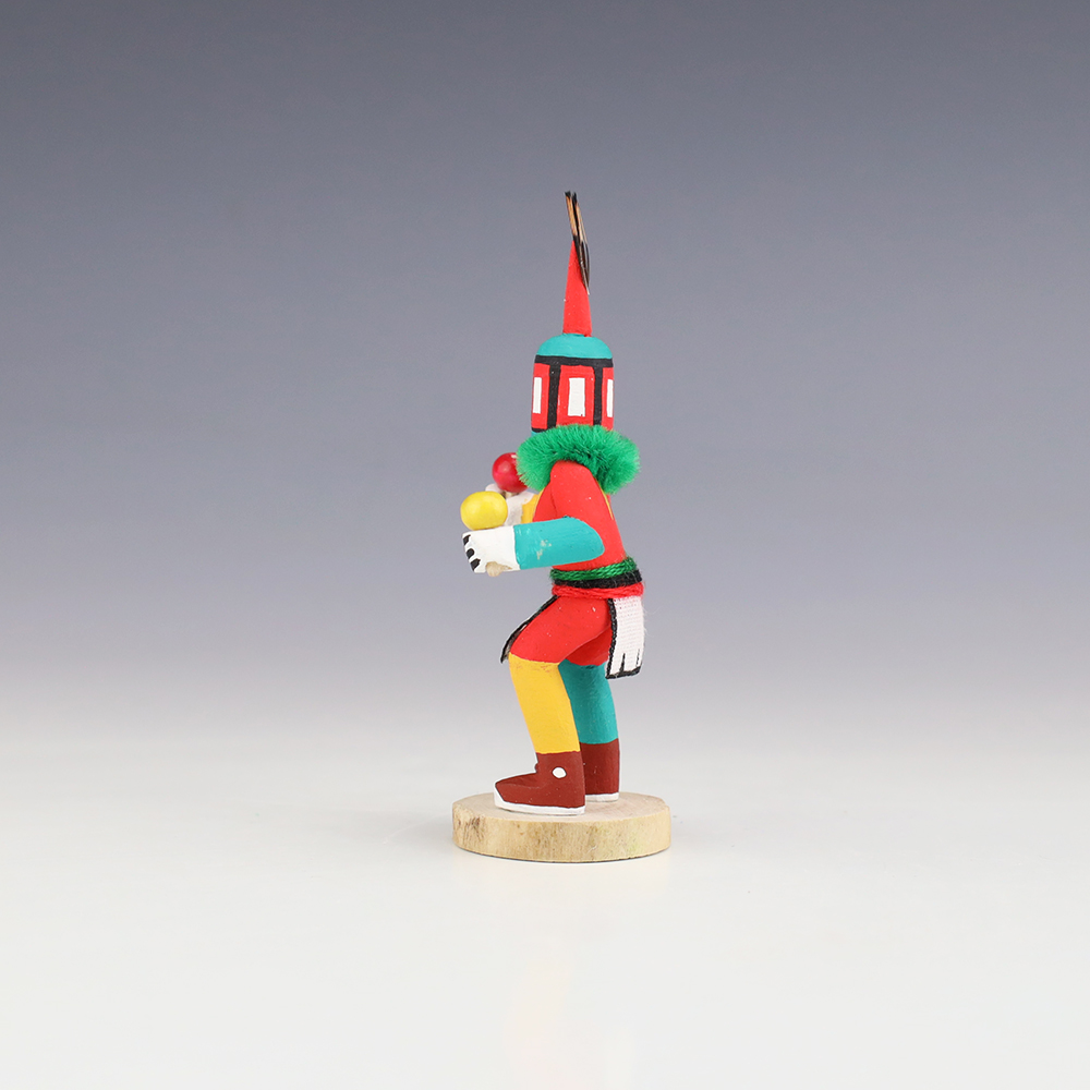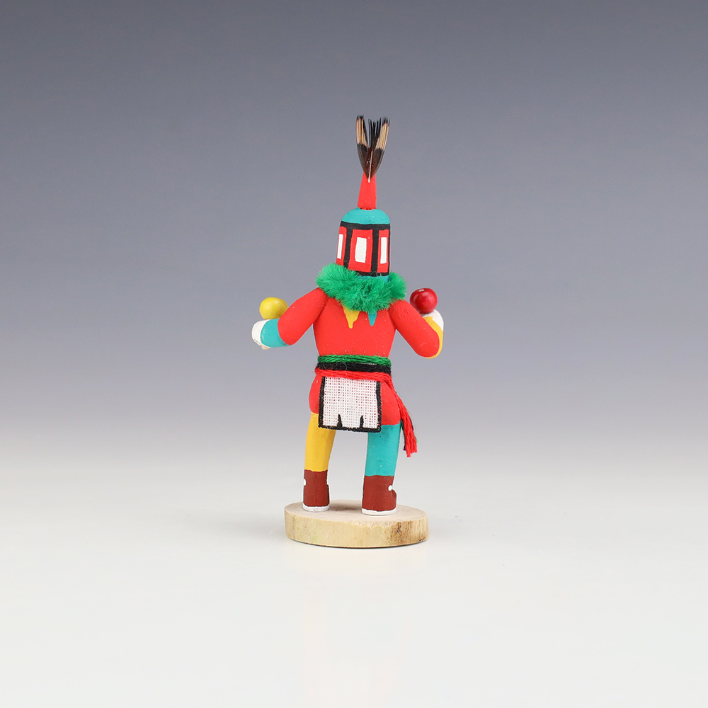 Hopi/Acoma artist Adrian Leon creates wonderful miniature kachinas, and this Crazy Rattle Kachina is no exception. Delicately carved and painted, this marvelous carving would be a great addition to your kachina or Native American art collection. Signed