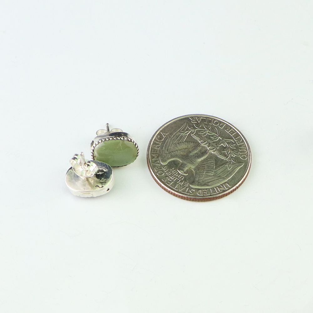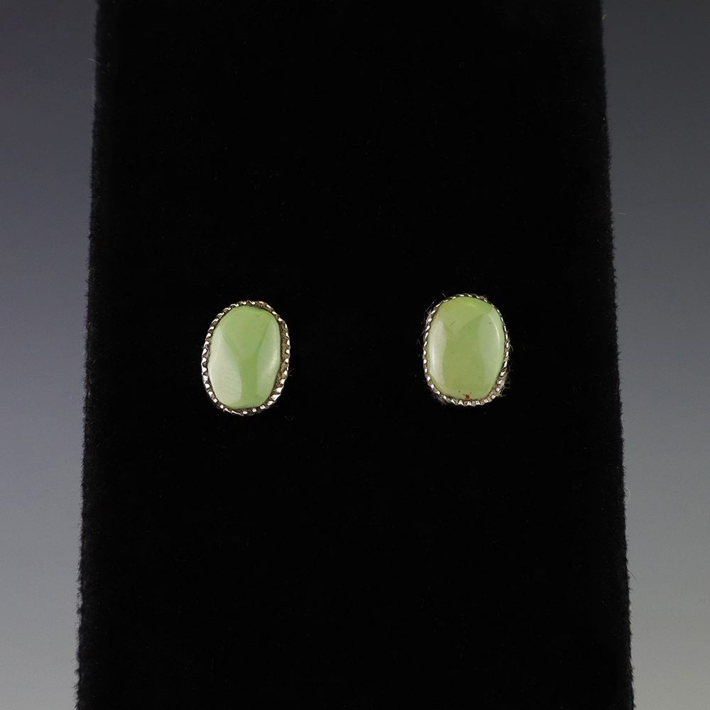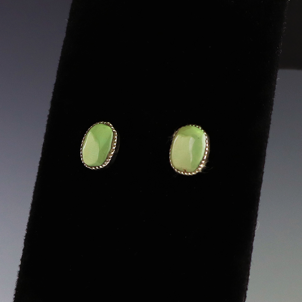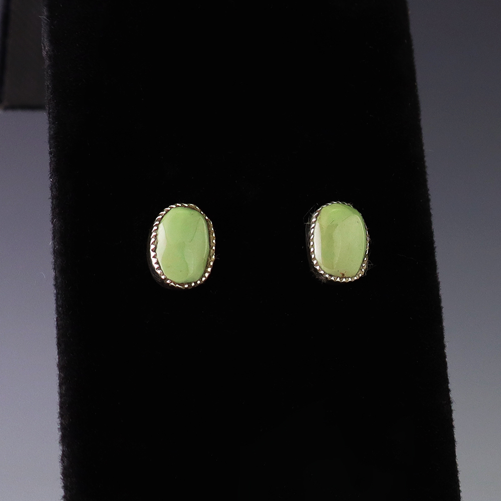 Zuni artist, Diane Lonjose created these lovely earrings. Made out of sterling silver and set with natural Emerald Valley Turquoise. The components are all hand fabricated and the stones are all natural. Diane comes from a family of Zuni jewelers. She is the daughter of Alice and Duane Quam, and grandchild of Doris and Warren Ondelacy. Weighs 2 gram. Signed