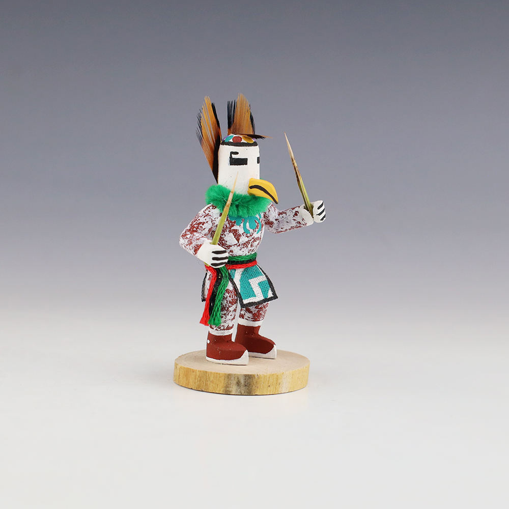 This Crow Kachina is wonderfully carved out of cotton wood. Hand made by Navajo artist Alfred Benally. A great addition to your Native American art or kachina collection. Signed 6 7/8″ tall x 4 1/4” long x 4” wide The Angwusi or Crow Kachina is usually seen teaming up with...