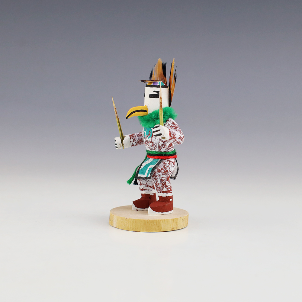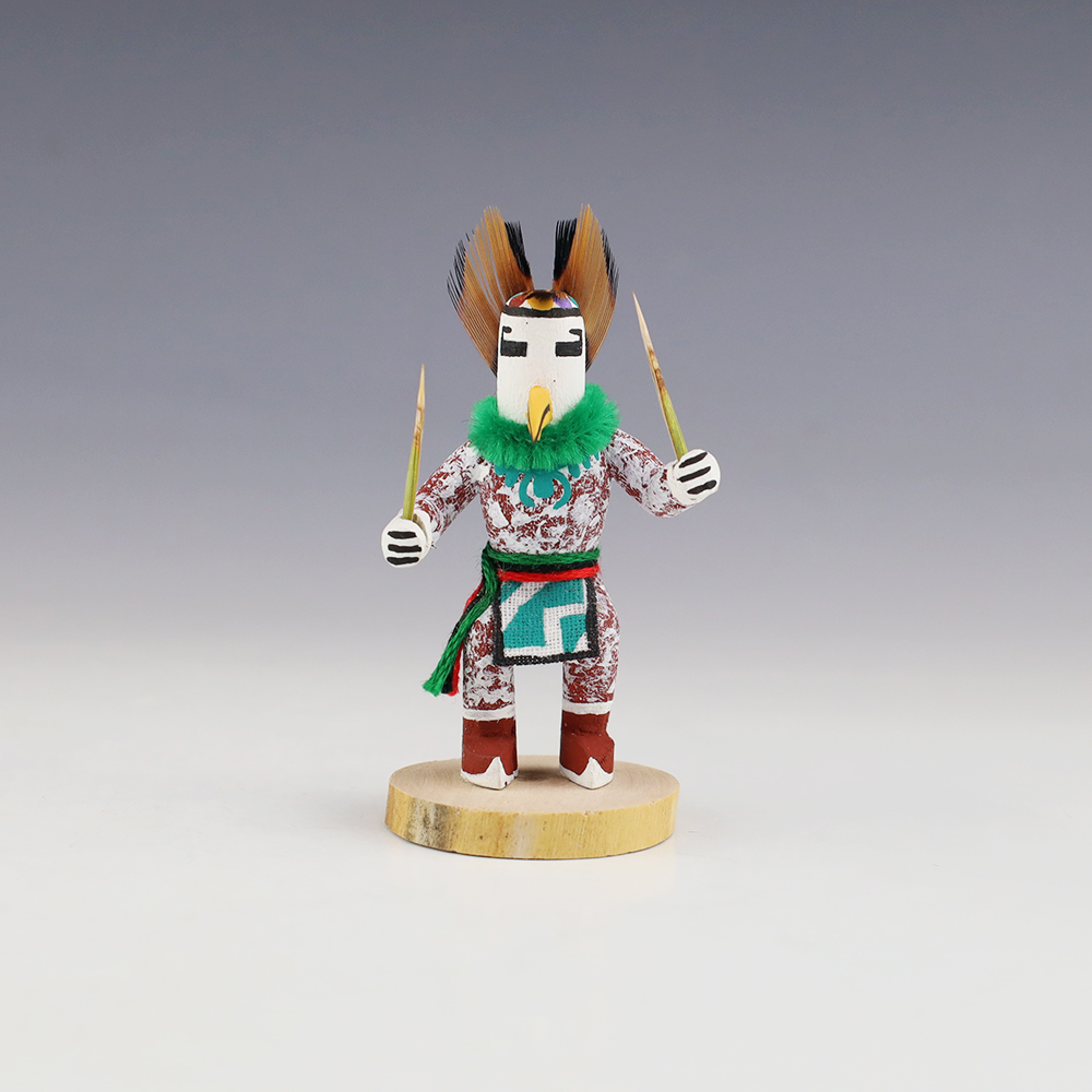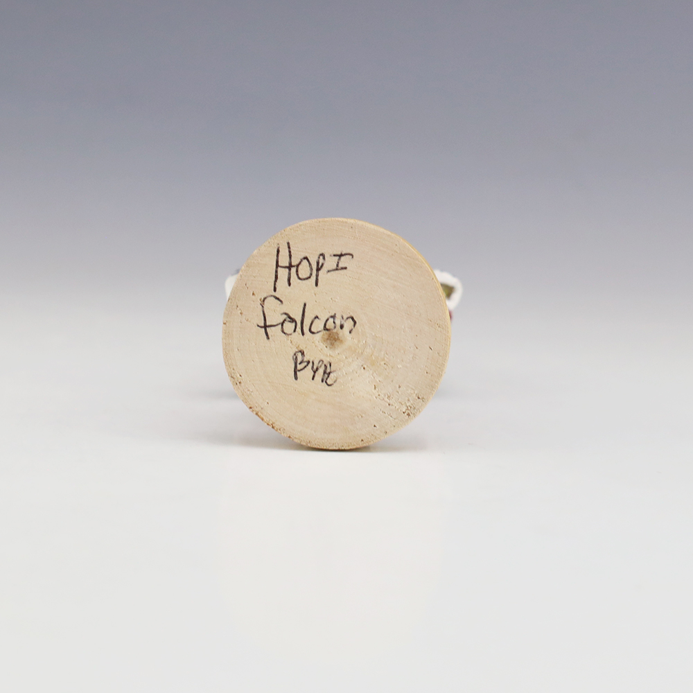 Hopi/Acoma artist Adrian Leon creates wonderful miniature kachinas, and this Falcon Kachina is no exception. Delicately carved and painted, this marvelous carving would be a great addition to your kachina or Native American art collection. Signed
