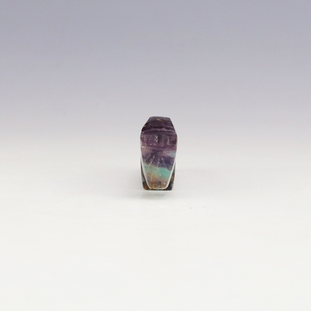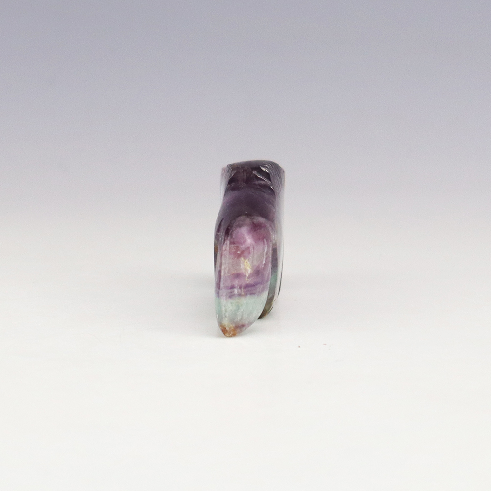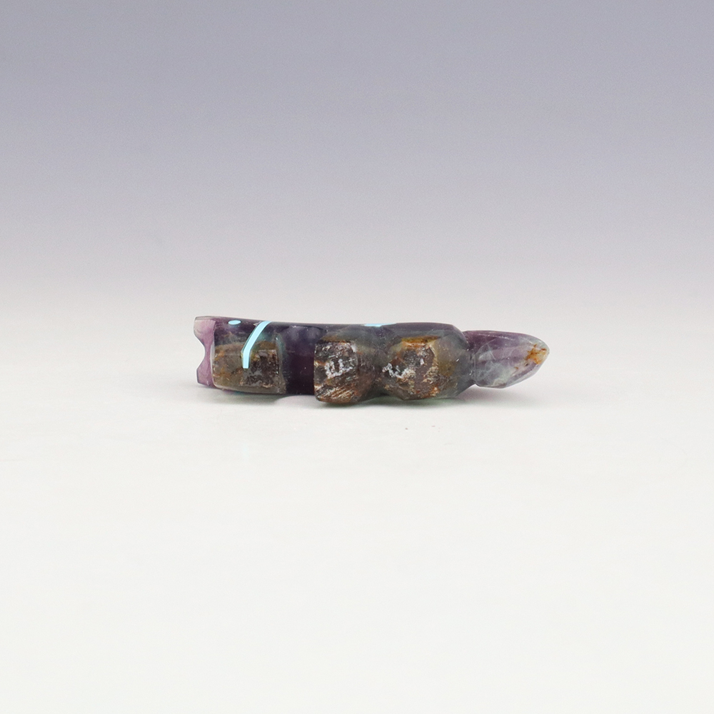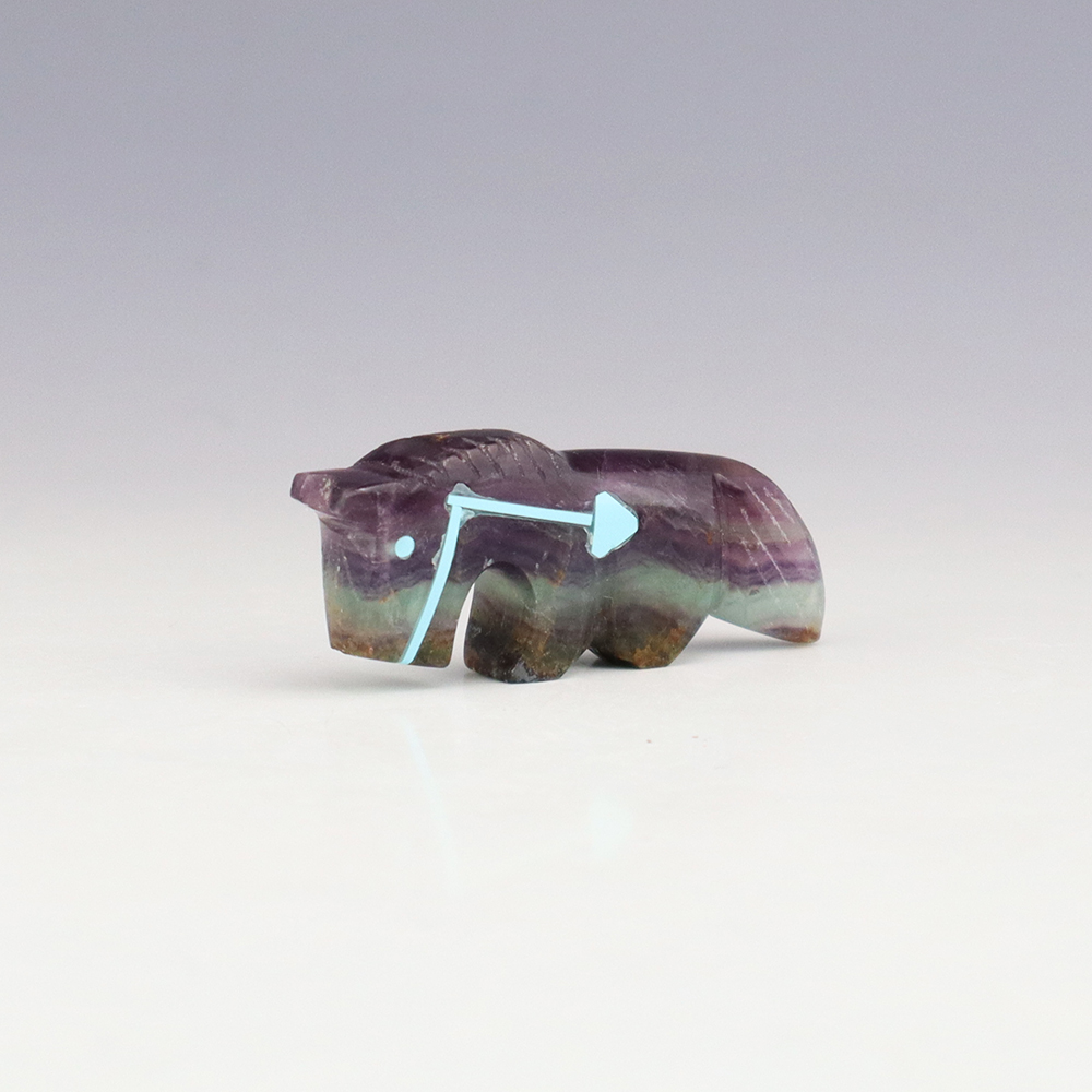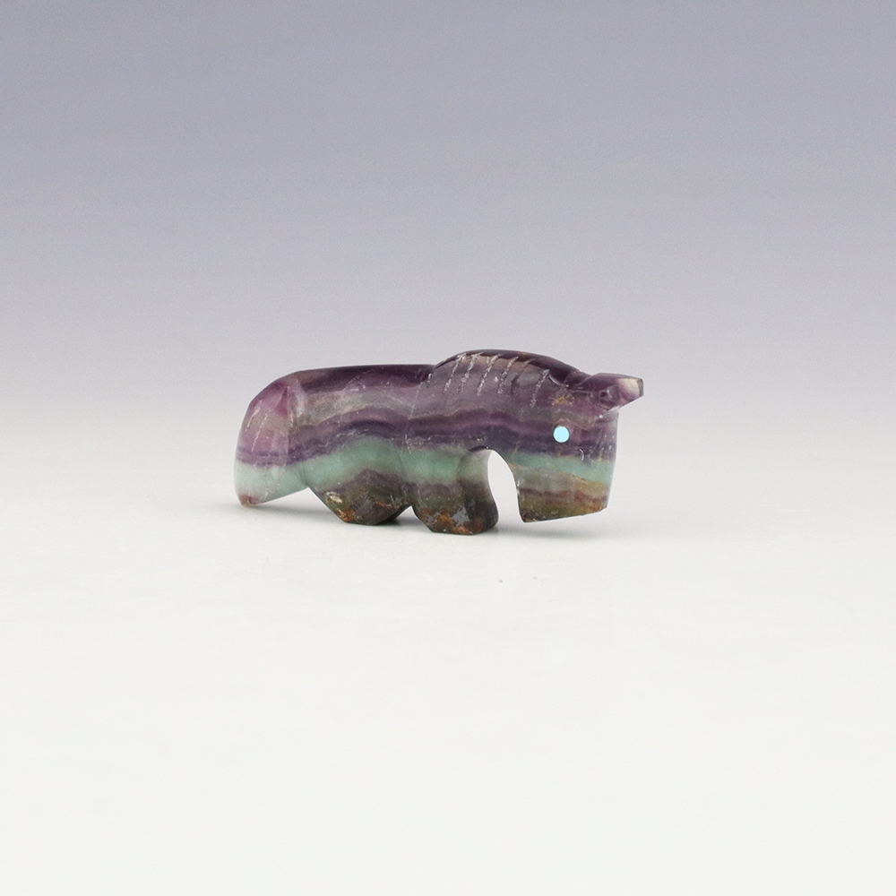 The Horse represents strength, swiftness, and possesses healing powers. Zuni fetish carver Kenric Laiwakete made this outstanding horse fetish. The horse carving is made out of Fluorite and has an inlaid Turquoise heartline. The Fluorite has natural fracturing, giving it beauty and character in the stone. Signed