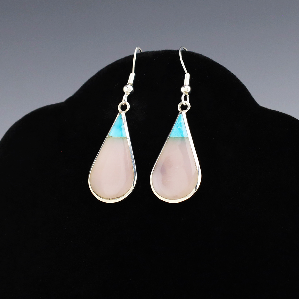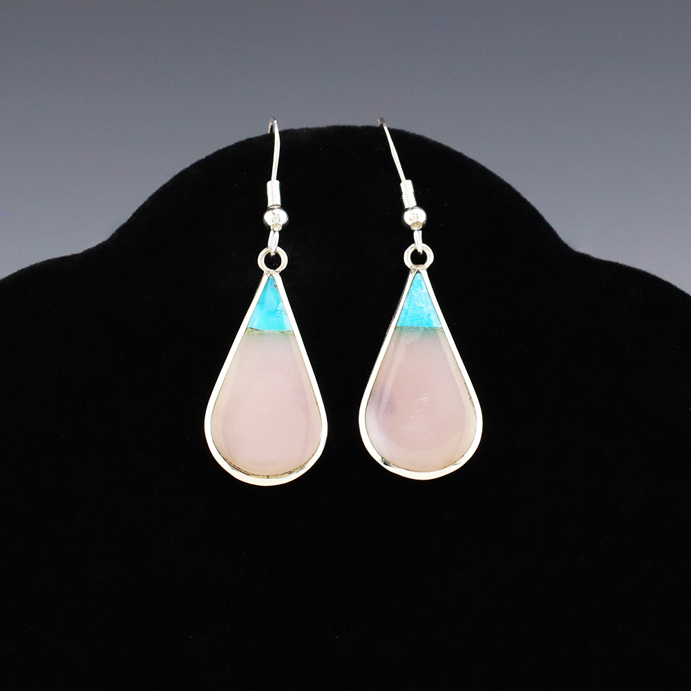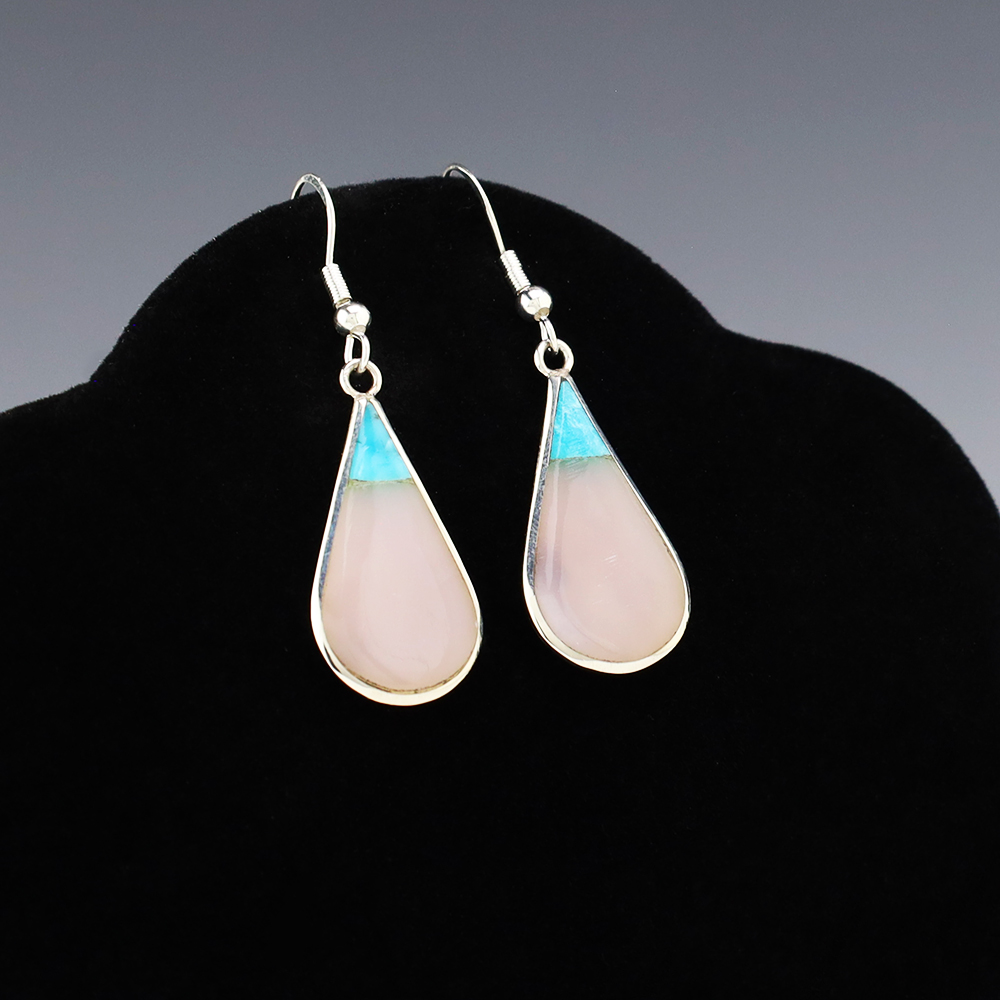 Zuni artists Nancy and Sheldon Westika created these lovely earrings. The Westikas have been making jewelry since the 1970’s and they are known for their fine inlay work. Made out of sterling silver and inlaid with Turquoise and Fluorite. Weighs 4 grams. Signed