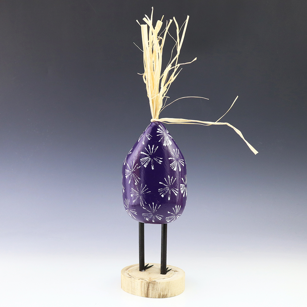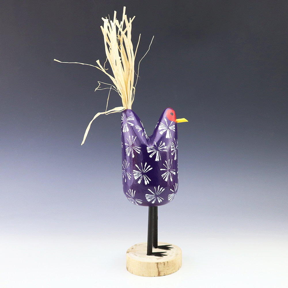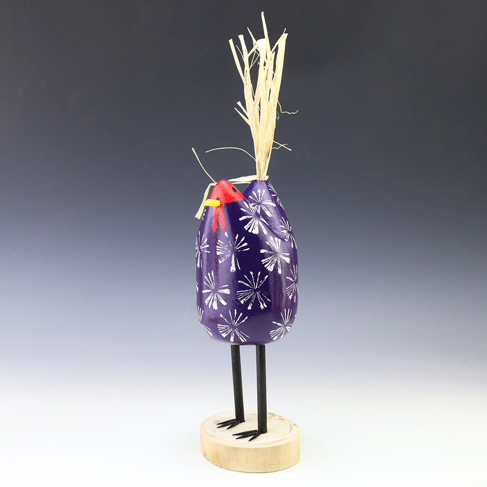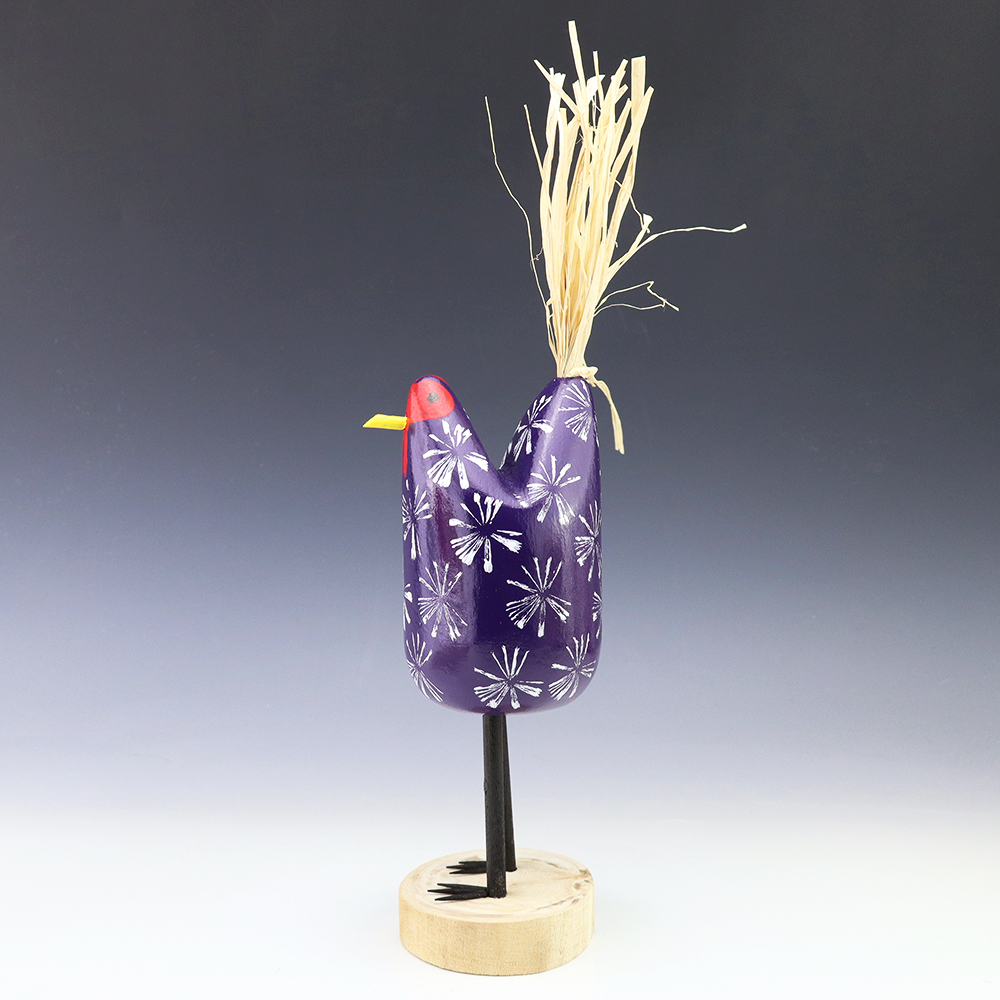 Edith John is the daughter of the late Woody Herbert who was known for his folk art Brahma bulls. Edith started carving while helping her father. Edith’s folk art chickens elicit happiness wherever they roost! Bold colors and patterns, that will brighten your Navajo folk art collection. Hand carved out of wood with a straw tail. Signed