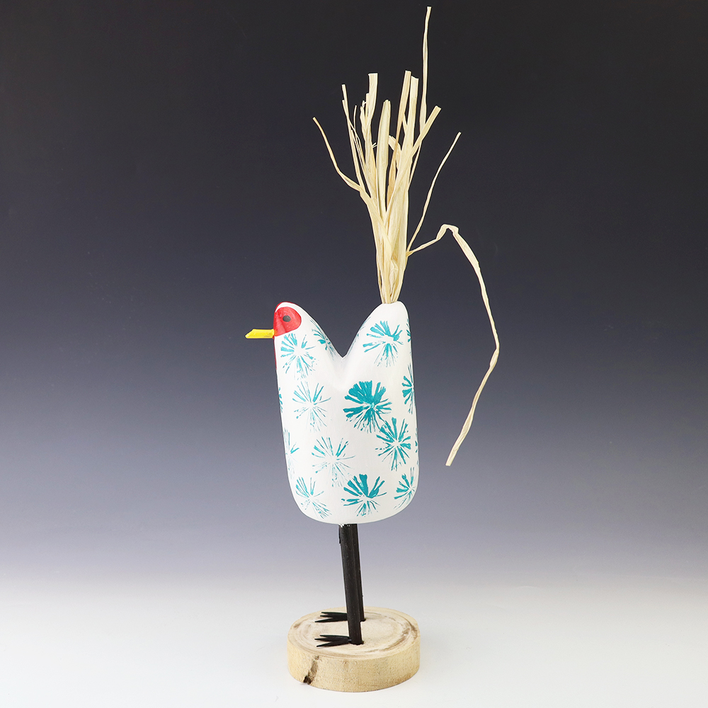 Edith John is the daughter of the late Woody Herbert who was known for his folk art Brahma bulls. Edith started carving while helping her father. Edith’s folk art chickens elicit happiness wherever they roost! Bold colors and patterns, that will brighten your Navajo folk art collection. Hand carved out of wood with a straw tail. Signed